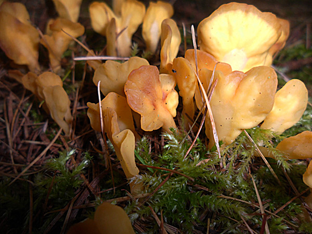 [font="Arial"]Die von Jörg gezeigten Fruchtkörper haben eine Phase der Trockenheit hinter sich, weshalb sie von den Spatelrändern (Hutrand) an Feuchtigkeit verloren haben und bräunlicher erscheinen. Das frische Moos kann nicht darüber wegtäuschen, dass es eine Phase der Trockenheit gab, denn der Dottergelbe Spateling erholt sich nicht von einer Trockenphase. Die Fruchtkörper gehen dann hinüber.