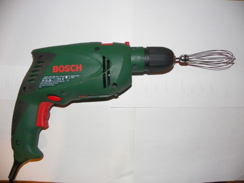 ich habe für große Mengen auch noch einen größeren Schneebesenaufsatz (Schneebesen kaufen, Griff absägen ... fertig ...) und einen Teigquirl (Maschinenaufsatz kaufen, Adapter absägen ... ferig), die sind aber beide gerade in der Reinigung und ich HATTE auch mal einen Pürieraufsatz (Herstellung siehe oben), der auch rohe Kartoffeln gefressen hat ... seit dem Versuch mit tiefgefrorenen Erdbeeren ist der aber leider nurnoch Klingensalat ... ich brauche was stabileres.