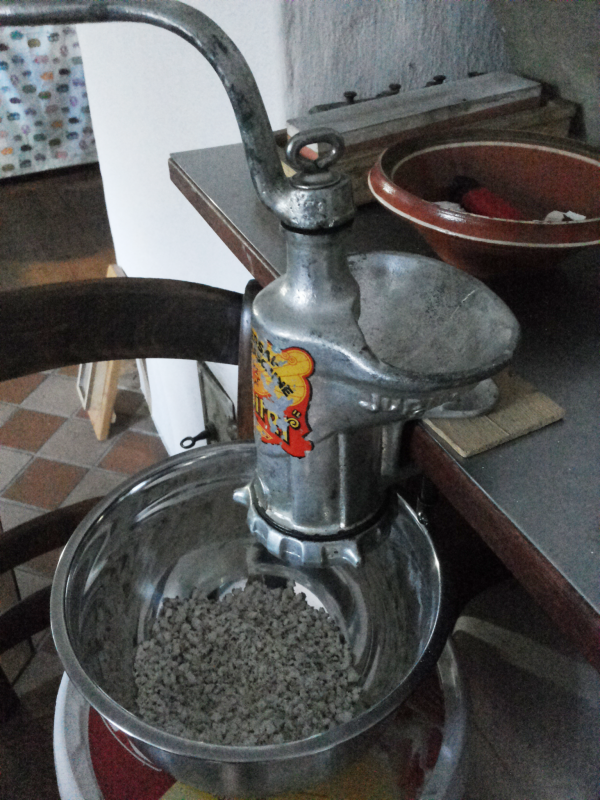 Dann habe ich es mit dem Fleischwolf probiert. Dabei die Stücke mit Gefühl nur in kleinen Portionen zugeben, sonst dreht es sich zu schwer. Manchmal muss man auch den "Rückwärtsgang" einlegen. Ging aber recht gut.