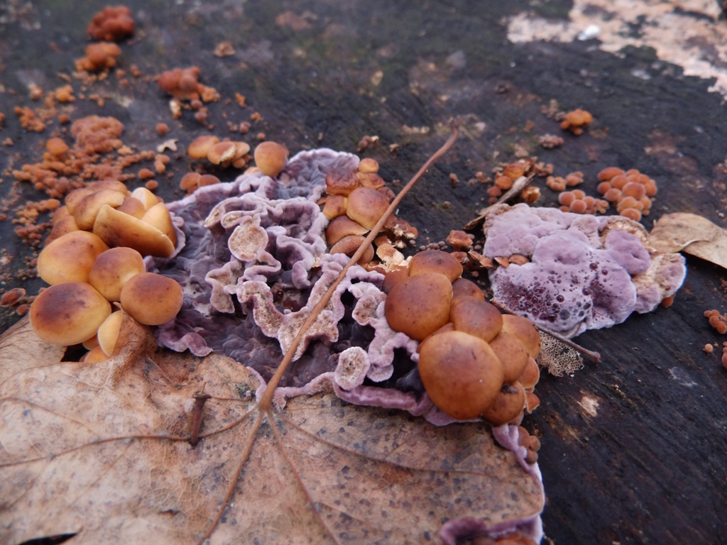 Gestern gefunden - Samtfußrüblinge (Flammulina velutipes) mit Violettem Knorpelschichtpilz (Chondrostereum purpurreum) auf einem Stubben.