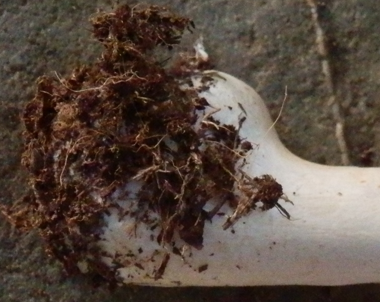 Stiel: 8 cm lang, zylindrisch, mit abgewinkelter Knolle an der Basis, leicht hohl