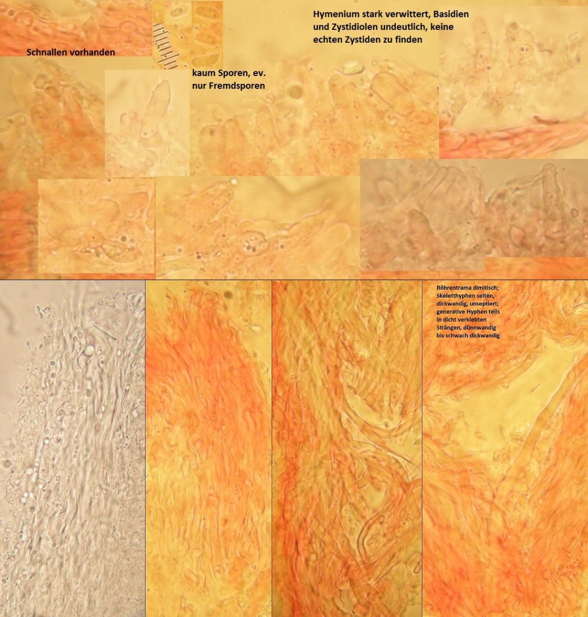 Regelrechte Zystiden kann ich auch nicht entdecken, dafür ist der Pilz dimitisch. In der Röhrentrama nur mit vereinzelten Skeletthyphen. Dominierend sind hier stark verklebte, generative Hyphen mit schwer zu beobachtenden Schnallen. Inkrustierungen konnte ich nicht beobachten.