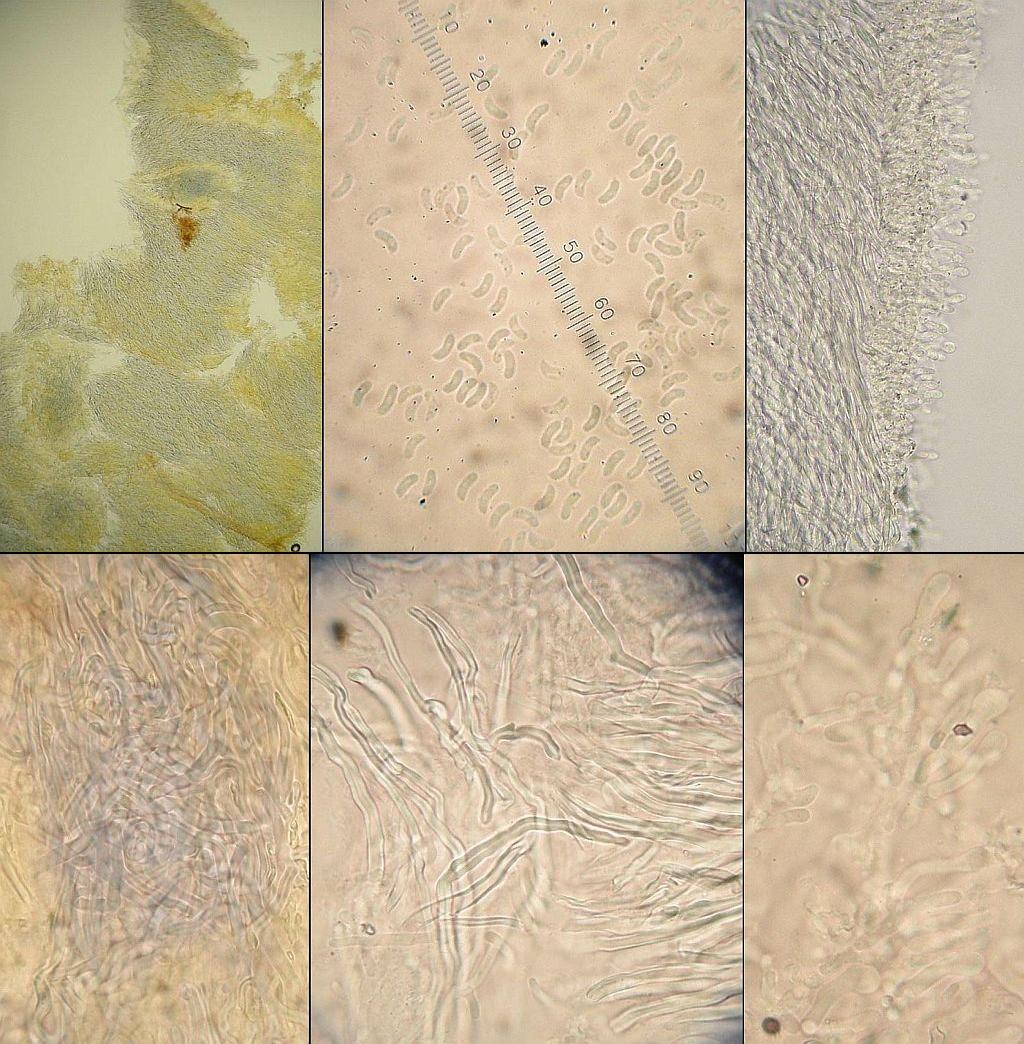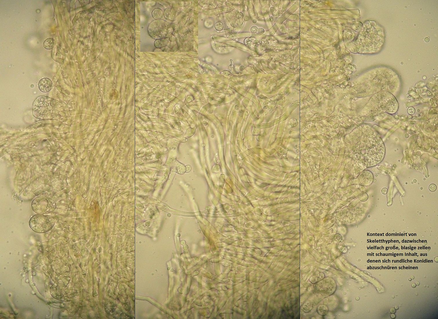 Das Hutfleisch / Kontext besteht überwiegend aus dickwandigen, unseptierten Skeletthyphen. Dazu kommen aber seltsame oleifere Hyphen, die sich zu dicken, sackartigen Gebilden auswachsen, die teilweise fast wie Gloeozystiden aussehen, aber offenbar rundliche Konidien abschnüren.