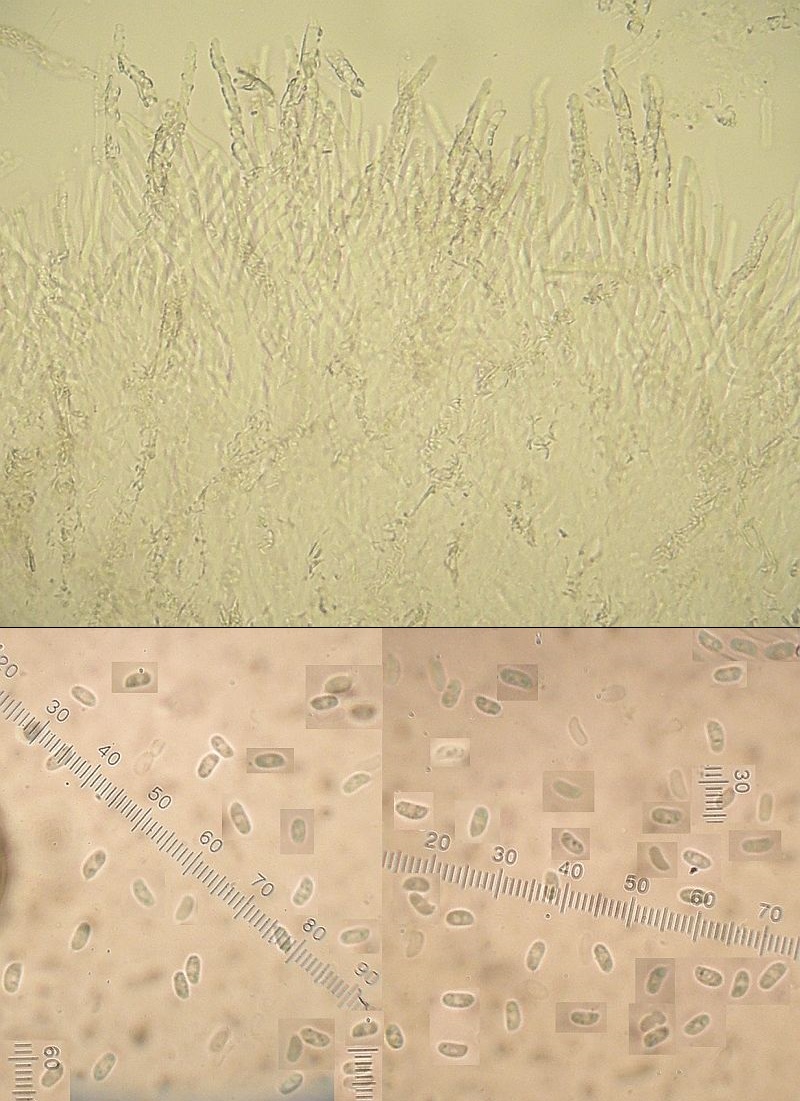 Oberer Bildteil zeigt nochmal die Hyphen an den Röhrenmündungen, unten die neu vermessenen Sporen.