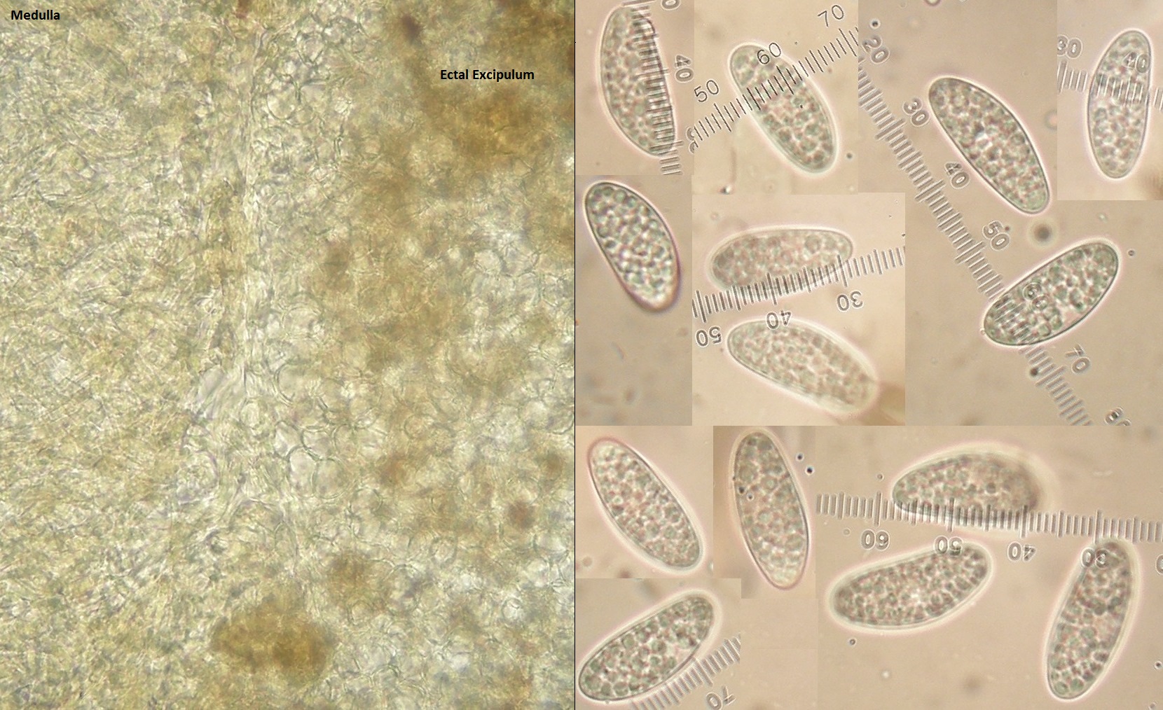 Wenn ich mir die zwei großen Tropfen in den noch nicht septierten Sporen angucke, glaube ich nämlich nicht, daß das Ectal - Excipulum aus kugeligen Zellen aufgebaut ist (Textura globosa).