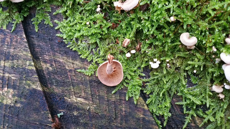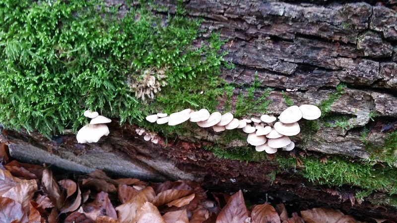 man muss zwar leider raten wo Pilz 2 & 3 anfängt - bei 1 & 4 bin ich der gleichen Meinung, Schwefelporling & Panellus stipticus. Wobei ich auch bei Nr.3 an Schwefelporling denke, lag der vielleicht auf dem Boden? Ich hatte mal ähnliches fotografiert, die Abbruchstelle mit dem Rest sah ziemlich ähnlich aus: