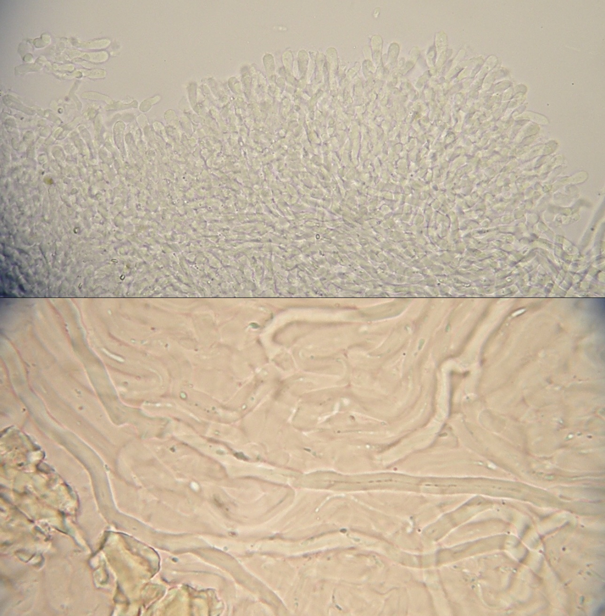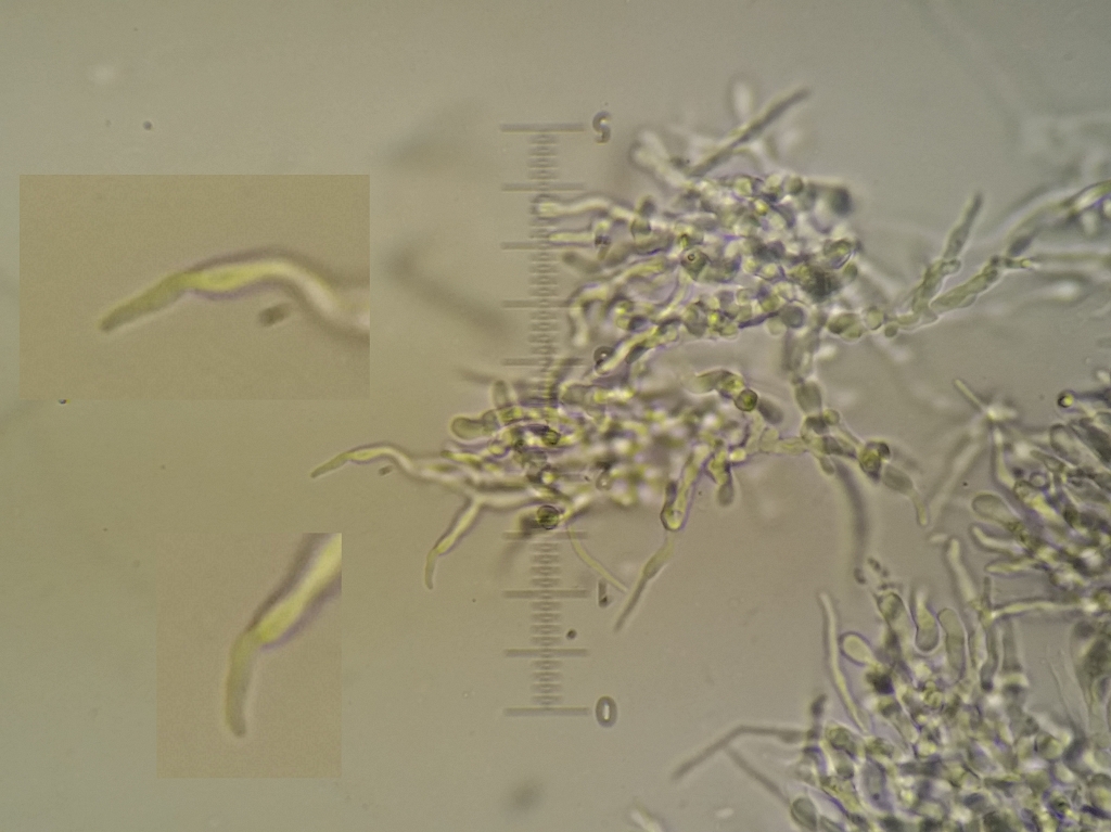 Für diese komischen dünnen Spitzen kann es verschiedene Erklärungen geben. Erst dachte ich, daß das wie Bindehyphen aussieht, aber da muss man schon arg quetschen und schieben, daß sich da welche aus Kontext oder Trama bis ins Hymenium verschieben. Alternativ wären Enden von Skeletthyphen oder skeletoiden Hyphen denkbar. Die ragen bei vielen Porlingen auch aus unterschiedlichen gattungen manchmal ein Stückchen raus und ins Hymenium hinein, insbesondere nahe der Röhrenmündungen.