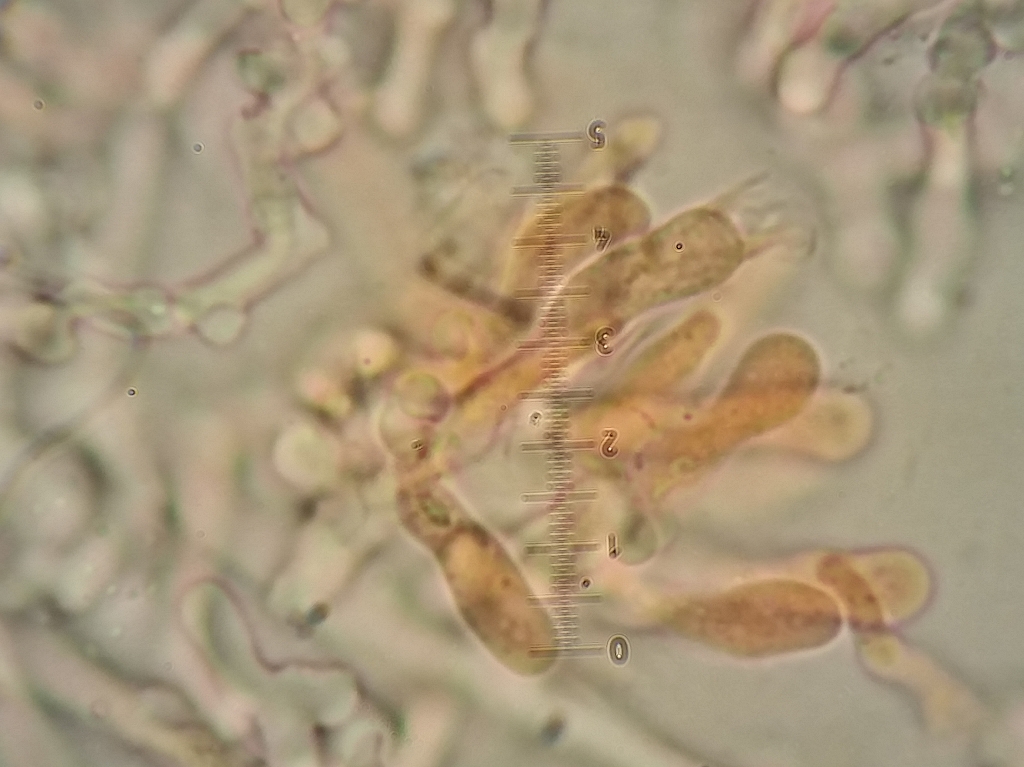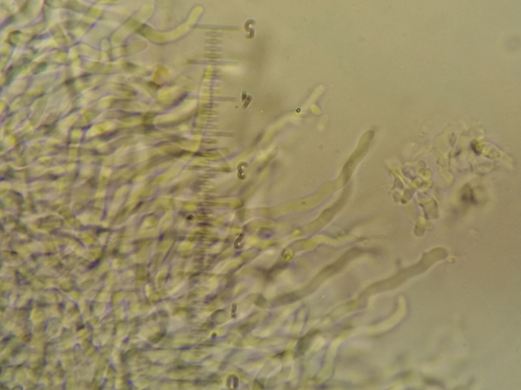 wie du richtig gesehen hast handelt sich um den 400er Objektiv bei mir ist ein Strich gleich 2 µm, Antrodiella hatte ich auch schon ausgeschlossen, es War ja auch nur mein erster Gedanke nach den Makroskopischen Merkmale. Nicht das ich Antrodiella schon mal gefunden hätte.