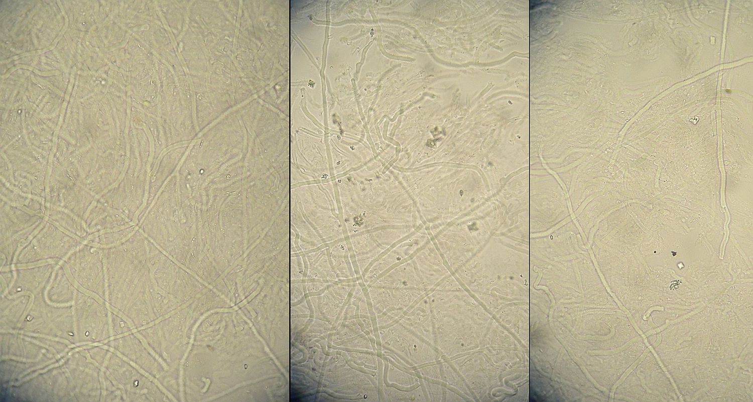 Ich habe noch mal den Kontext mikroskopiert diesmal sehr nah am Holz und ich könnte mir vorstellen das diese hier Skeletthyphen sind oder?