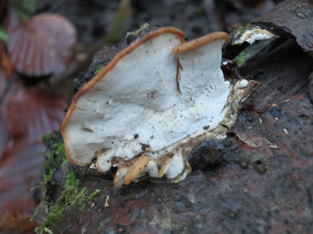 2. Vollresupinat; irgendwie grünlich irisierend, mit weißem Rand; ich dachte an Inonotus, konnte aber nichts Stimmiges finden:
