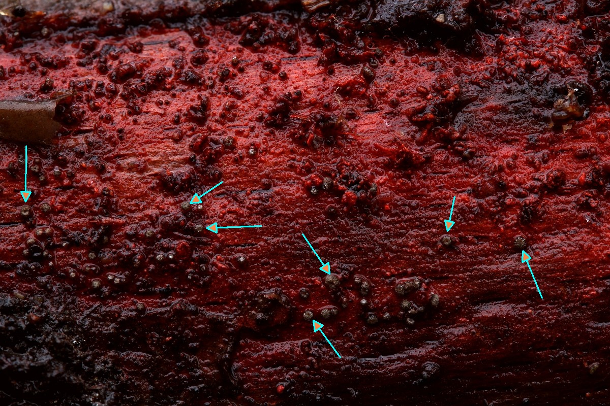 Das rot verfärbte Holz könnte sehr gut von Phanaerochaeta sanguinea verursacht wurde sein. Aber da kein Fruchtkörper zu finden war, wage ich hier keine Bestimmung. Die Phanaerochaete fand ich später im Jahr noch, in einem anderen Bericht wird sie noch vorgestellt werden.