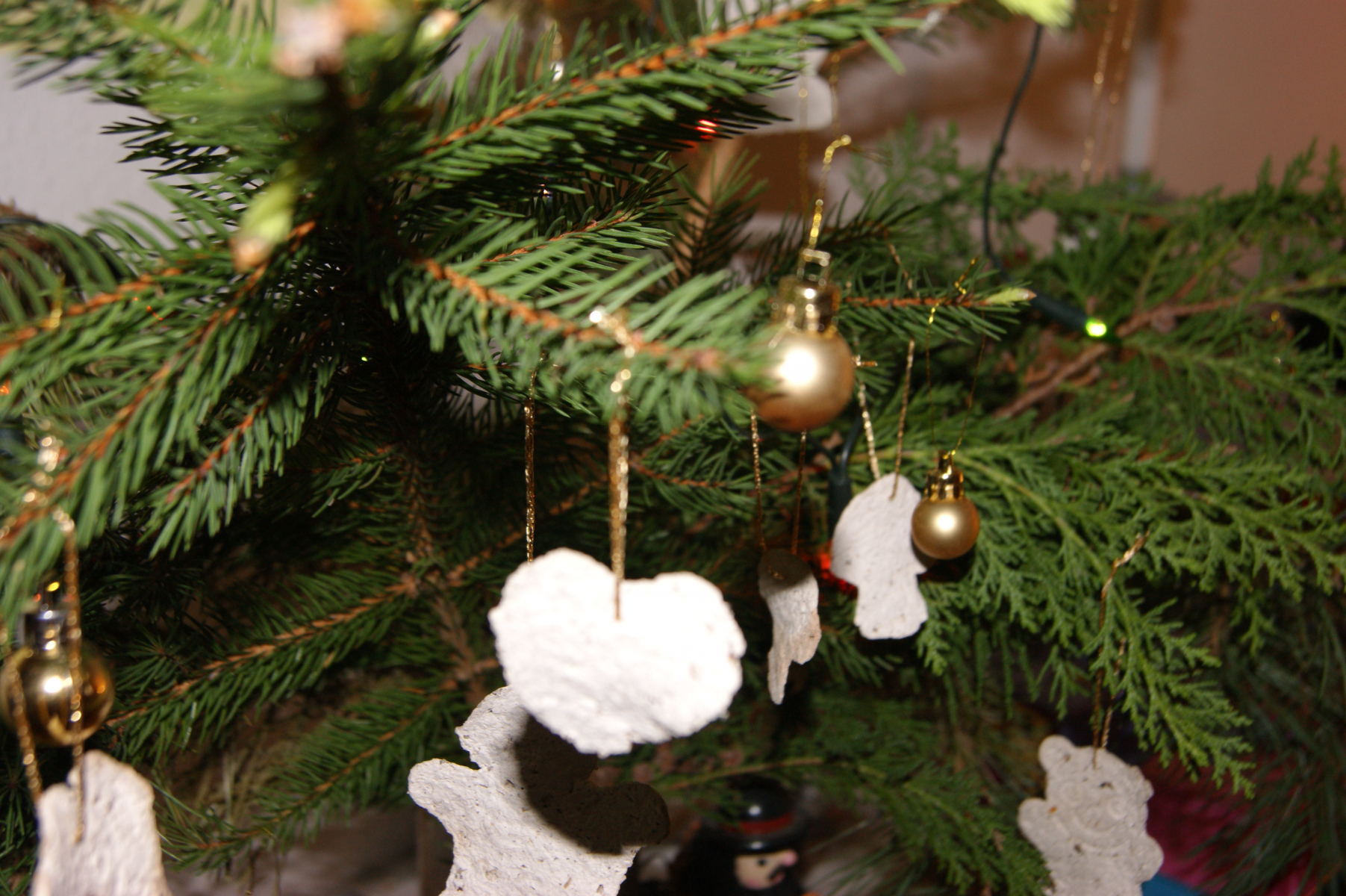 Dann noch einen Faden rein und an weihnachtliche Zweige aufgehängt: