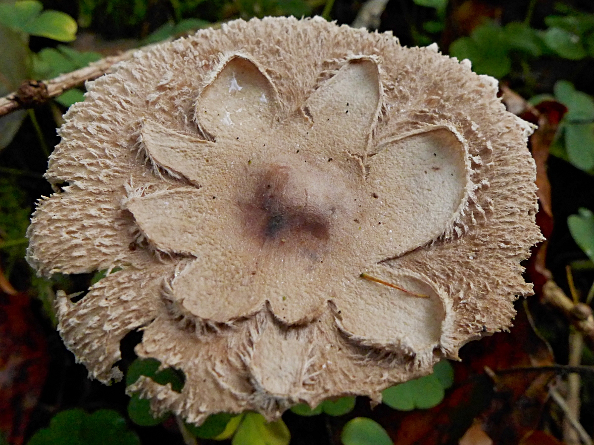 Winzige Riesenschirmpilze, alle unter 10 cm im Durchmesser, einer war nur 5 cm, nur im aufgeschirmten Zustand mit deutlichem Buckel, sehr grobschollige sternförmige Mitte, sehr faseriger trübfarbener Hut, sehr kleinteilige Natterung: