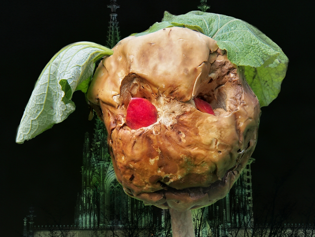 Ich hatte ursprünglich vor, eine "alemannische" Fasnachtsmaske aus vorhanden Pilzpildern zu basteln, ging aber nicht gut bzw. war mir zu aufwendig. Es gibt da so Dämonen- und Hexenmasken, auch in manchen Gegenden was mit Gemüse (also warum keine Pilze?). Ein Gesichtspunkt wäre dann die "Winteraustriebs-Funktion" gewesen, die da zumindest teilweise eine Rolle spielt. Das wäre aber - auch bei Gelingen des Bildes - möglicherweise erläuterungsbedürftig gewesen.