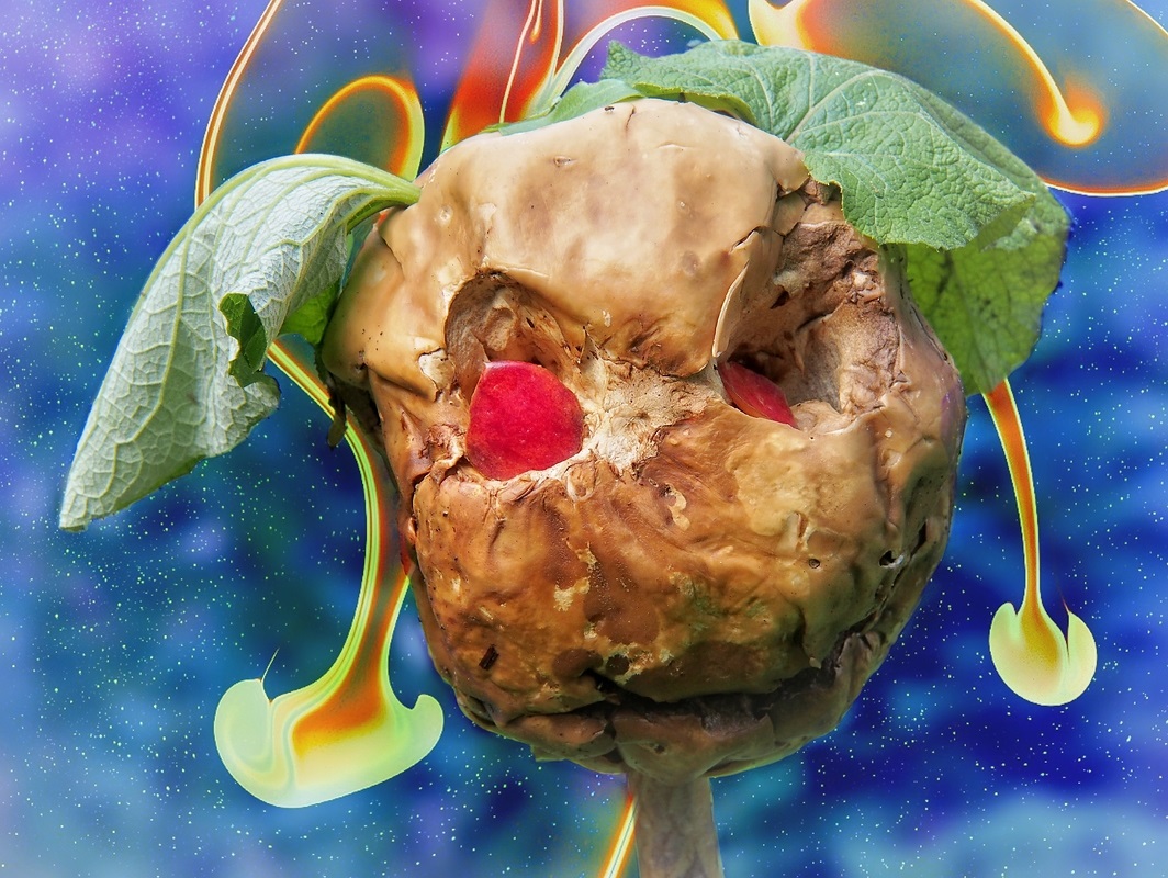 Übrigens ist das Originalfoto von dem Riesenbovisten tatsächlich 2015 entstanden, die Montage aber erst jetzt. Auf einer Wanderung entdeckten wir die etwas in die Jahre gekommene Bovistendame. Jemand hatte sie auf einen Stock drapiert an den Wanderweg gestellt. Ich fand das sehr kreativ, der etwas andere Pilzfund eben! Der Hintergrund ist übrigens keine Zeichnung oder Grafik, sondern das stark vergrößerte Foto einer Seifenblasenhaut über einer geöffneten Konservendose! (Wer darauf gekommen ist, kriegt von mir 100 Punkte.) Ich hatte einen ganzen Abend lang einen Heidenspaß beim Montieren immer neuer "Verkleidungsfotos". Damit sie nicht einfach so in der Tonne landen, hier noch ein paar andere Versionen (ich hoffe, Ihr fühl Euch dadurch nicht gespamt...)
