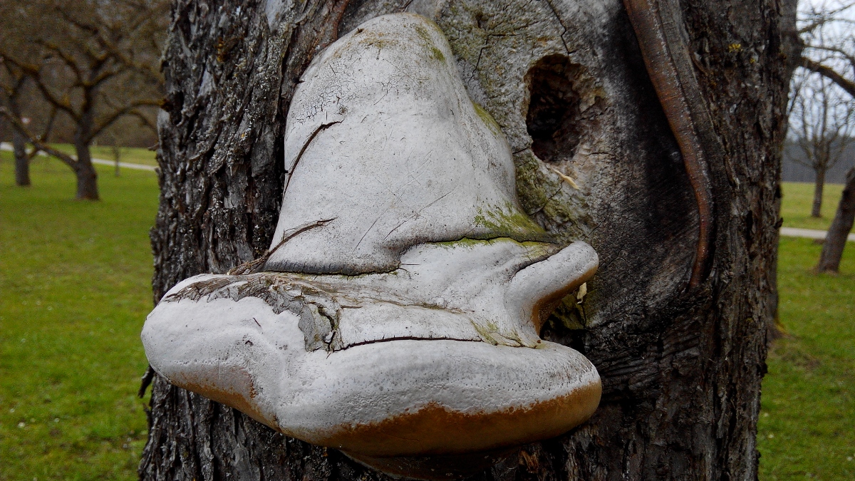 Tja, abeja, mein Moby Dick war wohl nicht so eindeutig. :D Es ist eine total verwachsene junge Buckeltramete. Ich hatte sie erst ganz fotografiert. Daheim beim Anschauen der Fotos kam mir Brechts Lied in den Sinn: "Und der Haifisch, der hat Zähne, und die trägt er im Gesicht ..." Ich ging zurück zum Stamm, deckte ein paar Pilzteile mit Moos und dem Blatt ab, knipste meinen nun offensichtlicheren Fisch und taufte ihn Moby Dick.