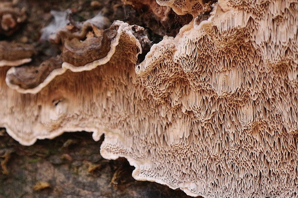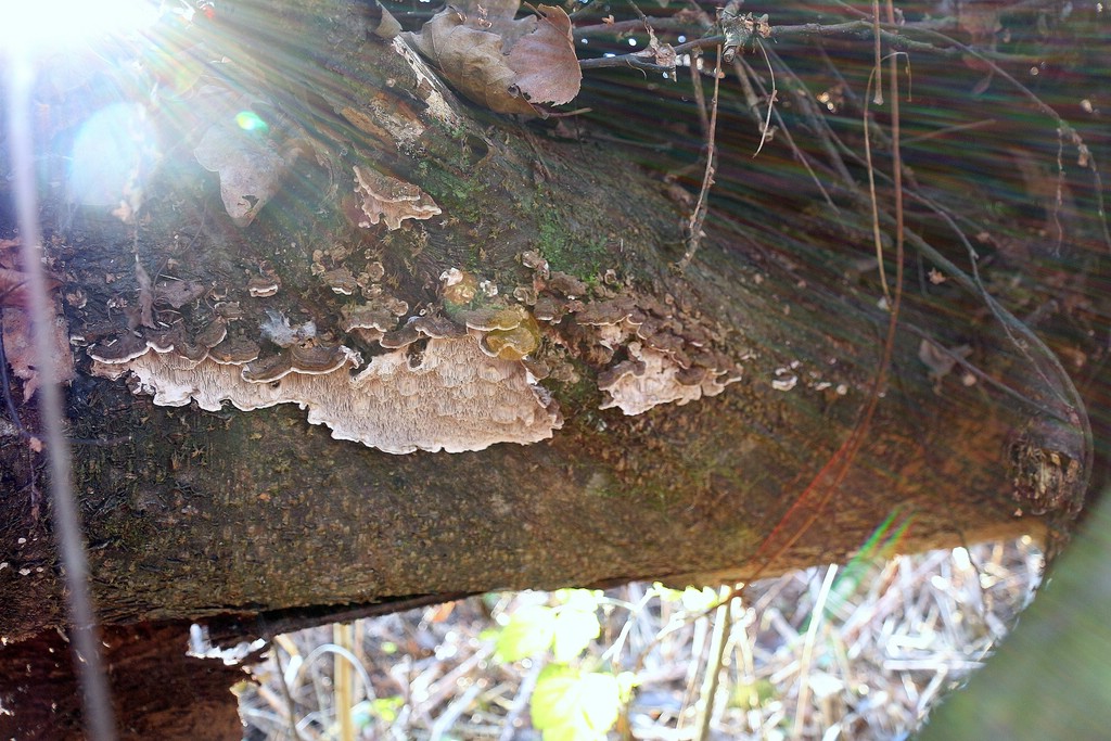 Bild 4 sollte einen Fruchtkörper an der Unterseite des Substrats zeigen, wobei ich mir dabei nicht im Klaren bin, was links davon für Pilze wachsen, denn nach meiner Theorie sollte das dann die Unterseite eines Pilzes (Fruchtschicht) zeigen.