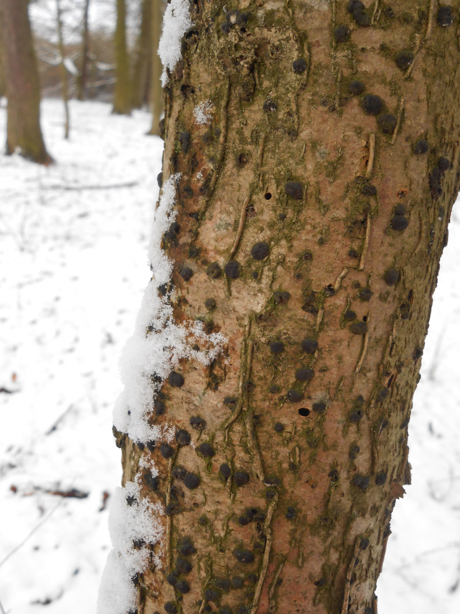 8.: Sind das Kohlenbeeren auf diesem Buchenstamm? Oder vllt. Buchen-Eckenscheibchen? Bitte erhellt mich!