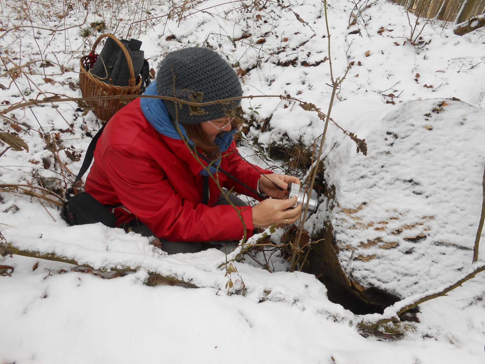 1.: Tuppie beim Fotografieren des vielleicht-Austernstammes. So rödelt sie, sonst unbeobachtet, meistens durch den Wald - tiefste Gangart! "Ich bin hier in dem Loch!"