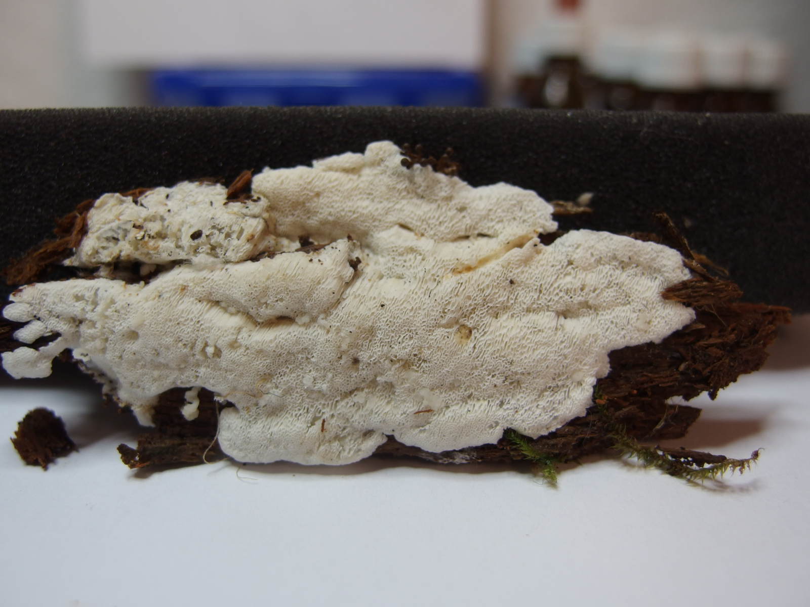 Fruchtkörper seitlich und an der Unterseite des Holzes, dünn und recht weich, Poren um 3/mm.