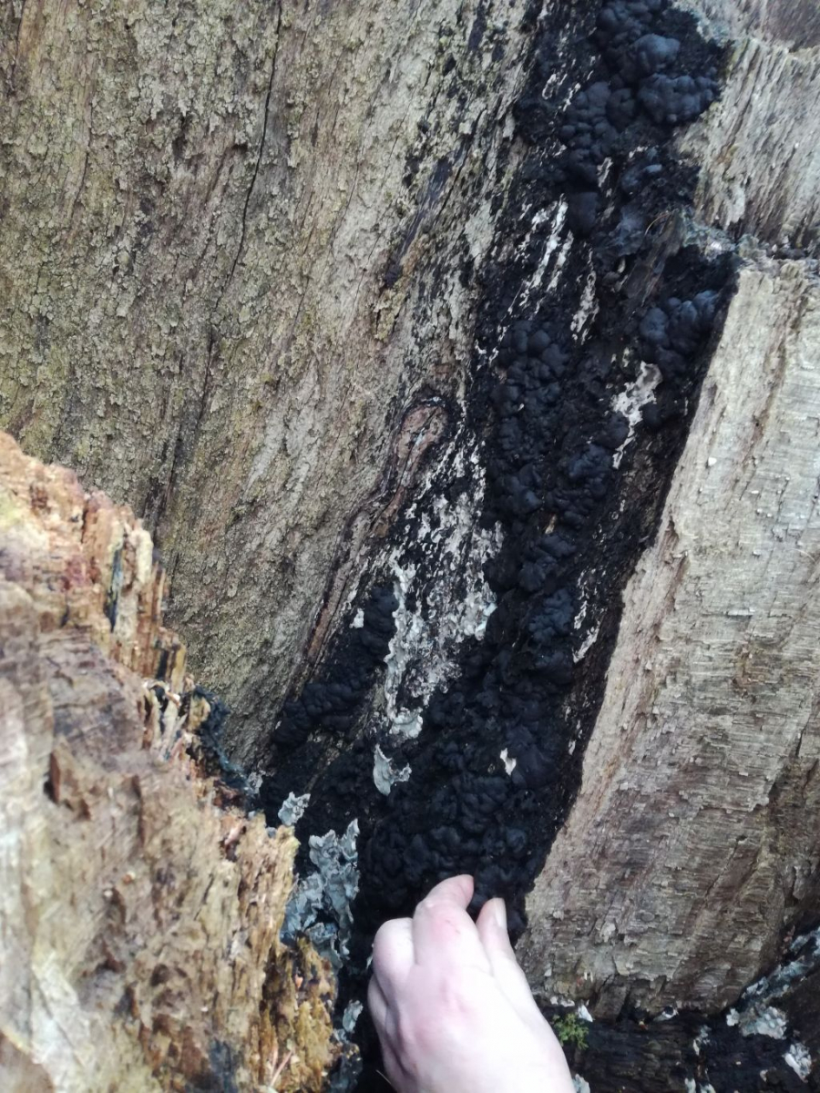 Wie die meisten von Euch richtig erkannt haben handelt es sich um den Brandkrustenpilz, Kretzschmaria deusta,Hypoxylum deustum, Ustulina deusta und sicher noch weitere andere)