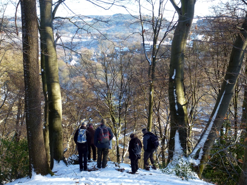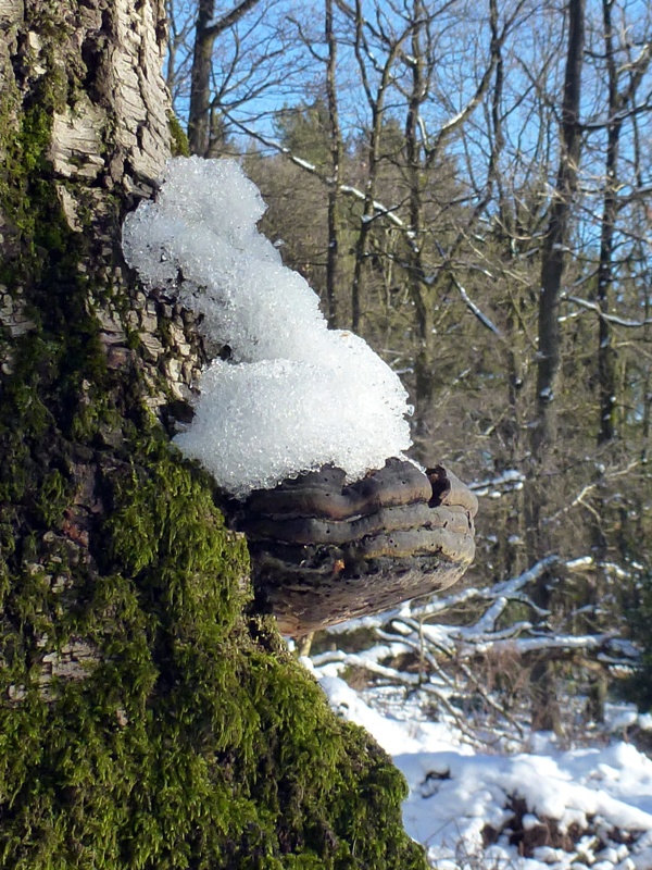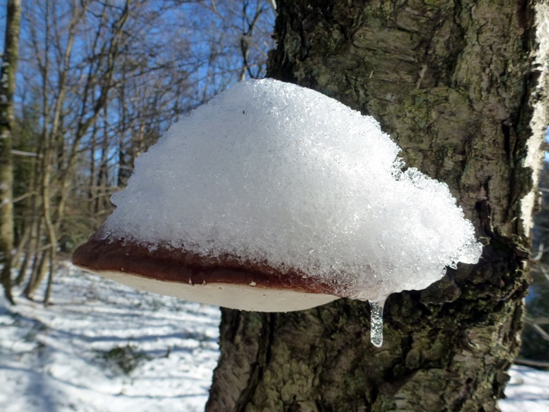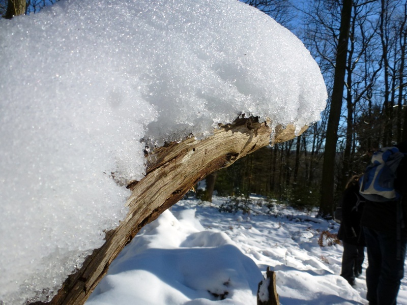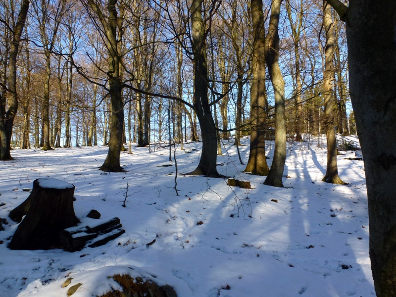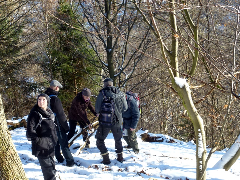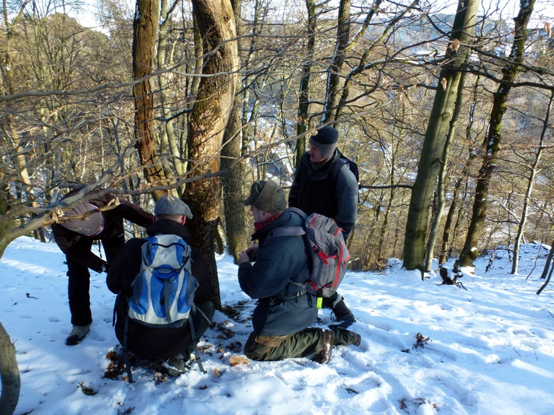 Gestern starteten wir die erste Kartierungsexkursion im neuen Jahr. Die Kälte lies den Teilnehmerkreis überschaubar bleiben, jedoch sollte sich der Tag für winterliche Verhältnisse prachtvoll präsentieren. Kaiserwetter, blauer Himmel und Sonnenschein ließen uns das kleine NSG bei Radevormwald so richtig genießen. Und von wegen kalt. Unter meiner Jacke herrschten mollige 30 Grad, bei Steigungen auch mehr. Ob der geschlossenen Schneedecke haben wir die sehr steilen Hänge dort nicht begangen, sondern uns auf den oberen, flacheren Bereich konzentriert. Und überraschend viele Arten konnten wir finden. Irgendwas um die 25 Arten konnten direkt vor Ort bestimmt werden, vieles wurde mitgenommen und wartet noch auf eine benamsung. Das Gebiet scheint hochinteressant zu sein. Vorwiegend Eichen mit eingestreuten Buchen, aber auch große, alte Birken die zum Teil schon abgestorben waren, versprechen einiges für die wärmere Jahreszeit. Die Hanglage scheint Hypogäenträchtig, wie auch viele Buddelstellen von Wildschweinen und Rehen zeigten. Überhaupt habe ich noch nie so viele Tierspuren gesehen, wie in diesem Stück. Kaum ein Quadratmeter ohne Trittsiegel. Das verspricht natürlich einiges für die coprophilen Arten.