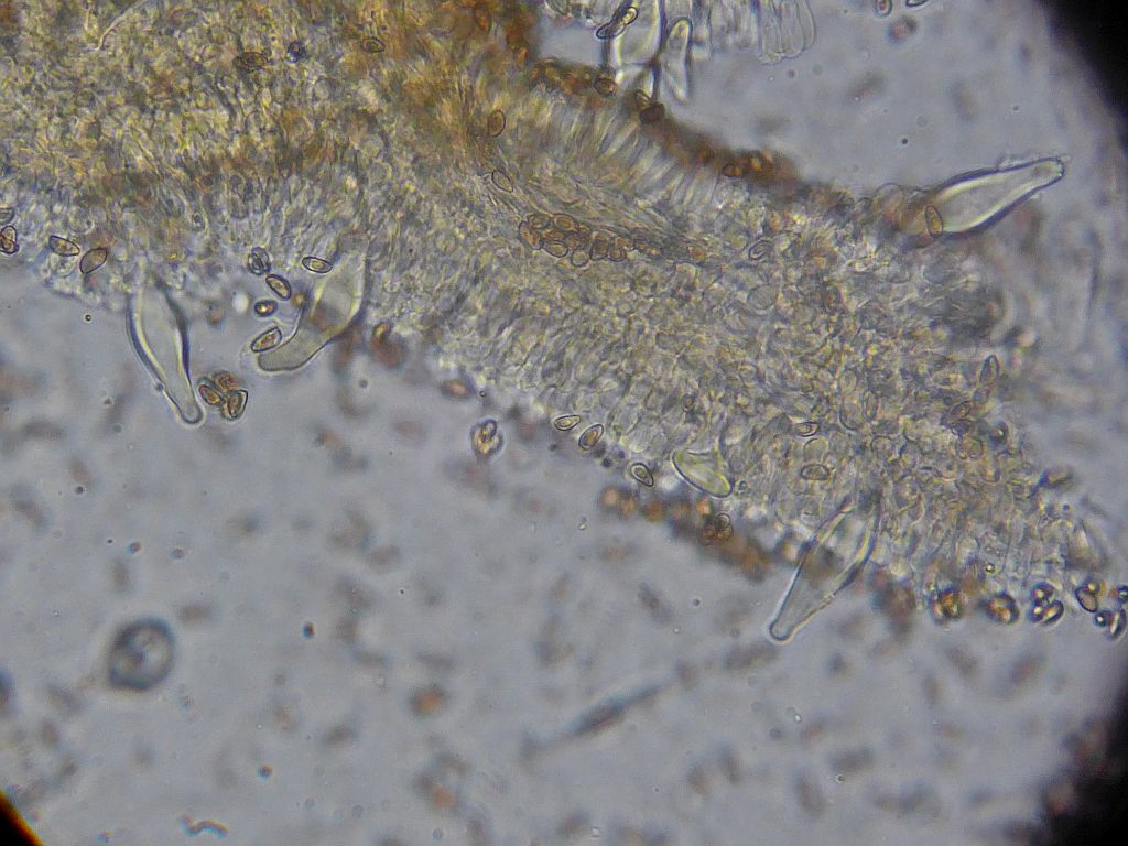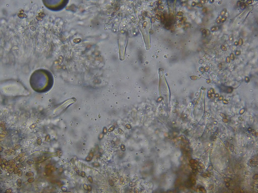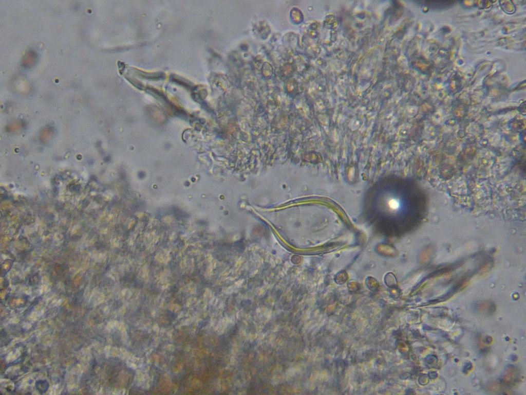 Zystiden: bis 70 x 17-21 µm; auffällig war auch die extreme Wanddicke; am Hals bis 4 µm und am Bauch bis 2 µm; schwache KOH-Reaktion