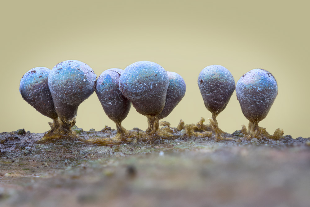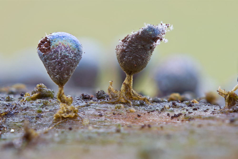 Dein Frühwerk sieht nach Badhamia aus. Man sieht das kalkhaltige netzige Capillitium. Die Peridie ist nur spärlich kalkhaltig. Da kommen mehrere Arten in Frage, vor allem da die Art gestielt ist. Auch wären die Wuchsbedingungen interessant.