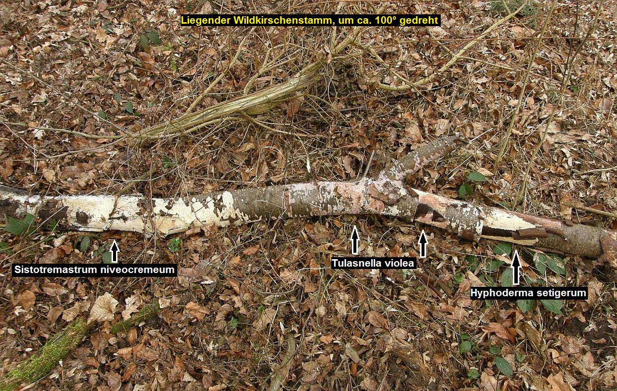 Zweitens an einem liegenden Vogelkirschenstamm, ebenfalls an den in den Luftraum ragenden teilen, ebenfalls initialmosch und noch vollständig berindet, vergesellschaftet mit Hyphoderma mutatum: