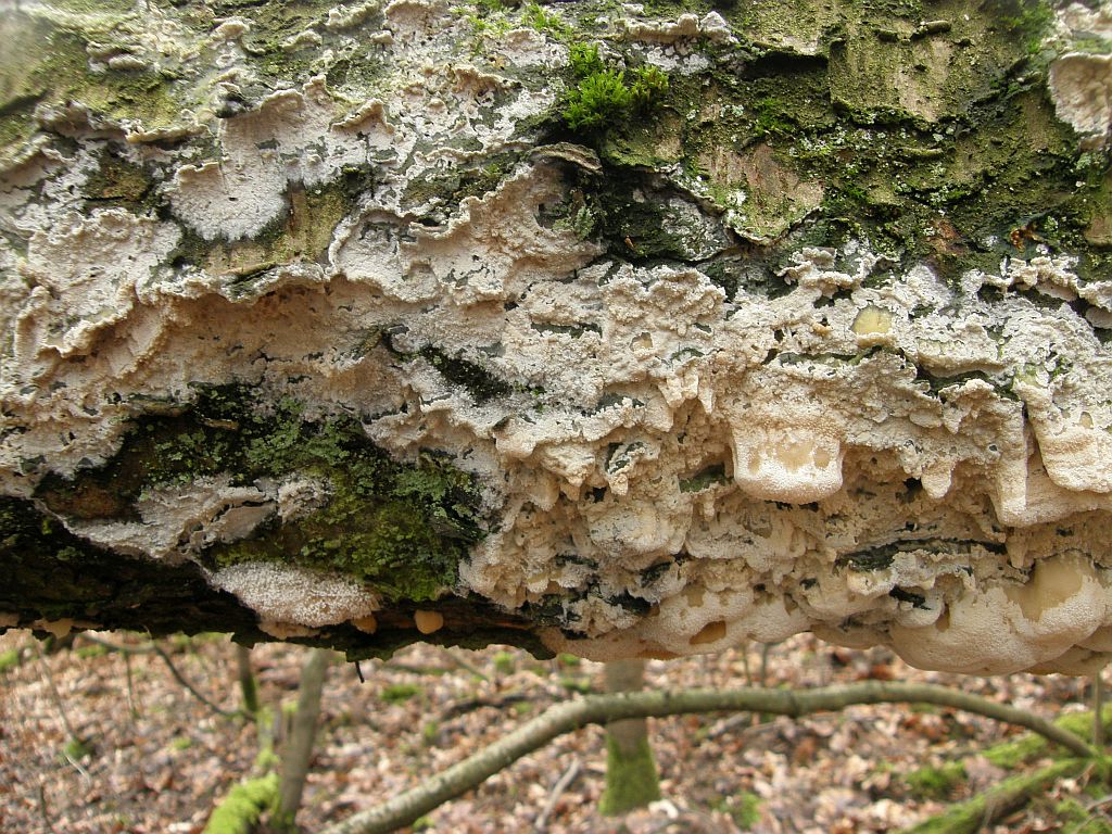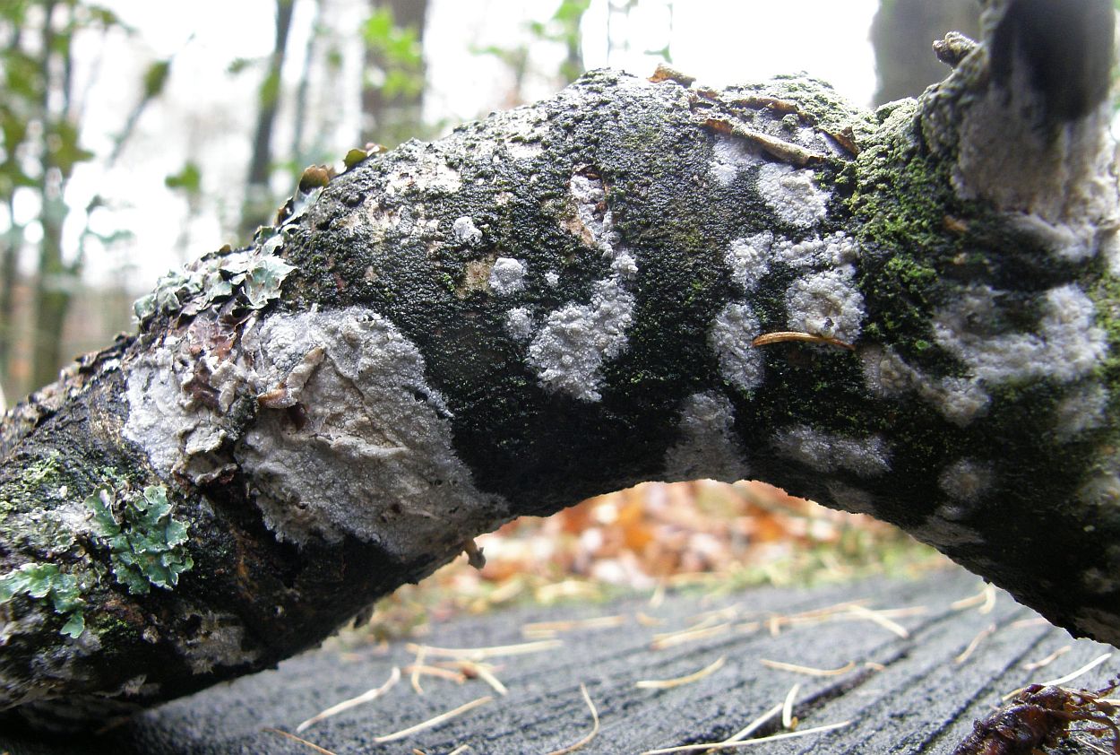 Erstens an einem liegenden, aber im Luftraum hängenden Rotbuchenstämmchen, vergesellschaftet mit Trametes hirsuta und diversen Kohlenbeeren: