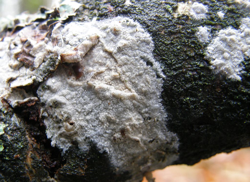 makroskopische Eigenschaften: Fruchtkörper anfangs kleinfleckig, kreisförmig ausbreitend und zu größeren Gebilden zusammenfließend; recht variabel in Form und Größe: manchmal als dünne, wachsig-häutige Beläge, aber auch mit sehr dicken, schwammigen Fruchtkörpern (extrem dick ausgebildetes Subhymenium), letztere gerne an gefallenen Ästen und Stämmchen im Luftraum an den Substratunterseiten; Oberfläche frisch weich / wachsartig; weißlich bis cremefarben oder ockerlich; schwach knubbelig / fein warzig bis fast zähnchenförmig; normalerweise fein behaart (Einschlaglupe!) durch herausragende Septozystiden.