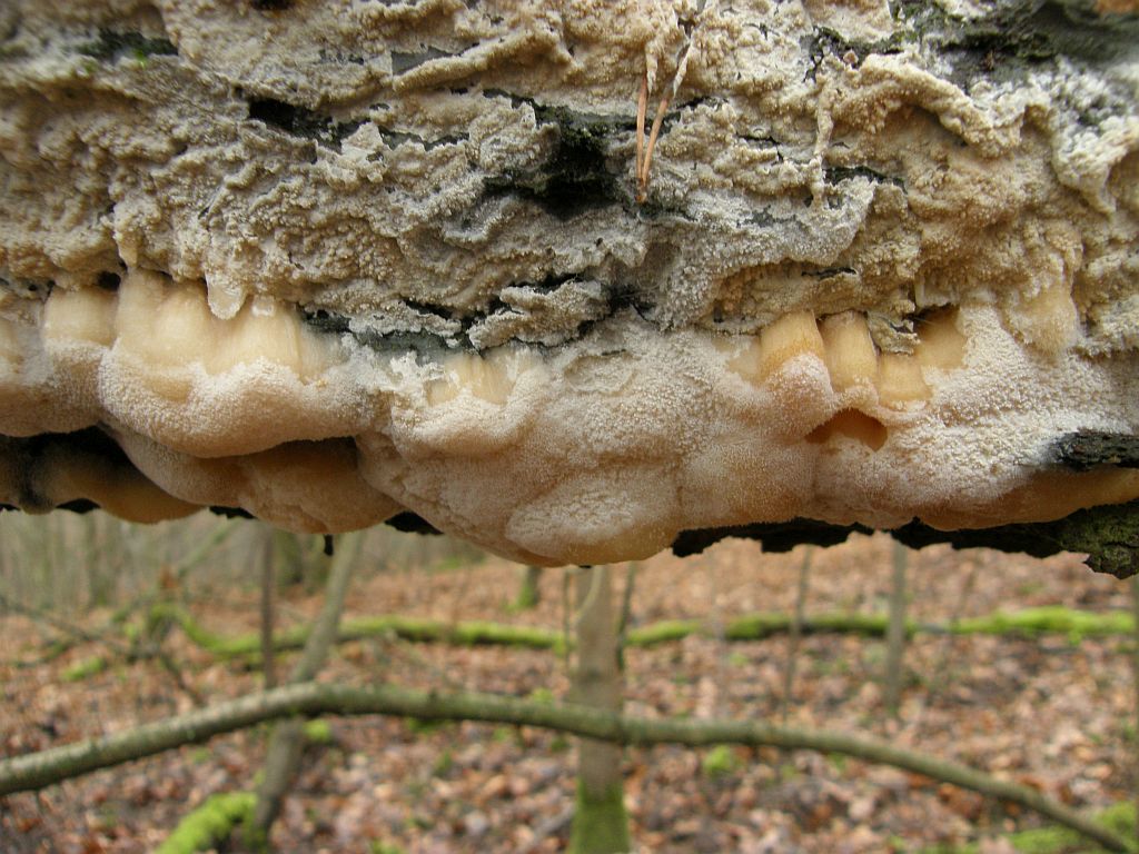 Und zwar ungewöhnlich erstens wegen der Ökologie: Normalerweise wächst Hyphoderma setigerum an hängendem Substrat (also abgestorbenes Holz "im Luftraum") oder an noch nicht lange liegenden Stämmchen und Ästen. Diese sind normalerweise auch wenig vermorscht, meistens noch berindet.