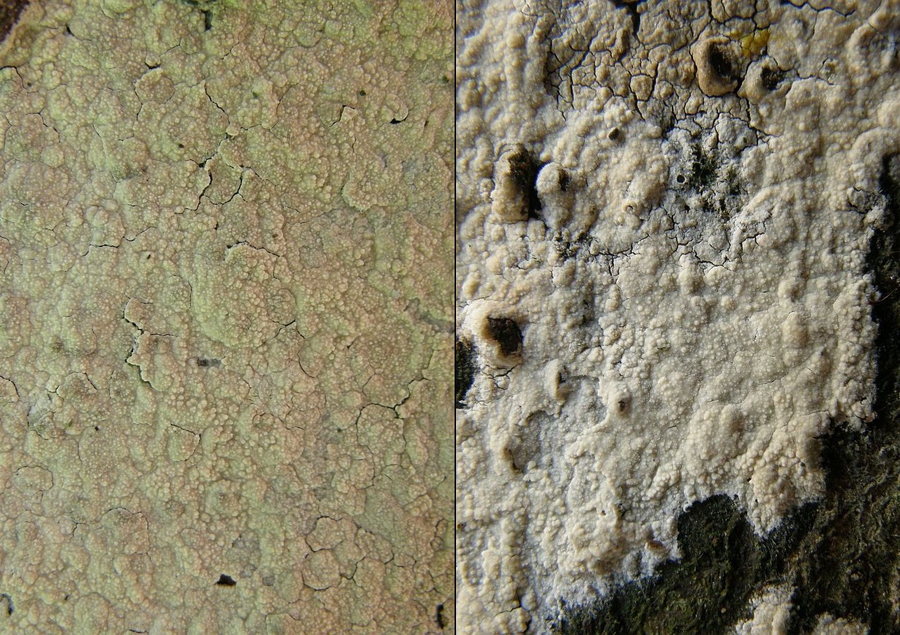 Verwechslungen: Die relevanten Bestimmungsmerkmale liegen im mikroskopischen Bereich. Ohne mikroskopische Untersuchung ist die Art nicht bestimmbar. Helle (weißliche) Krusten an Holz gibt es massenhaft, dennoch ist die Art gut definiert durch die Kombination folgender Merkmale:
