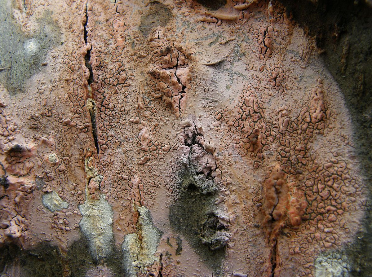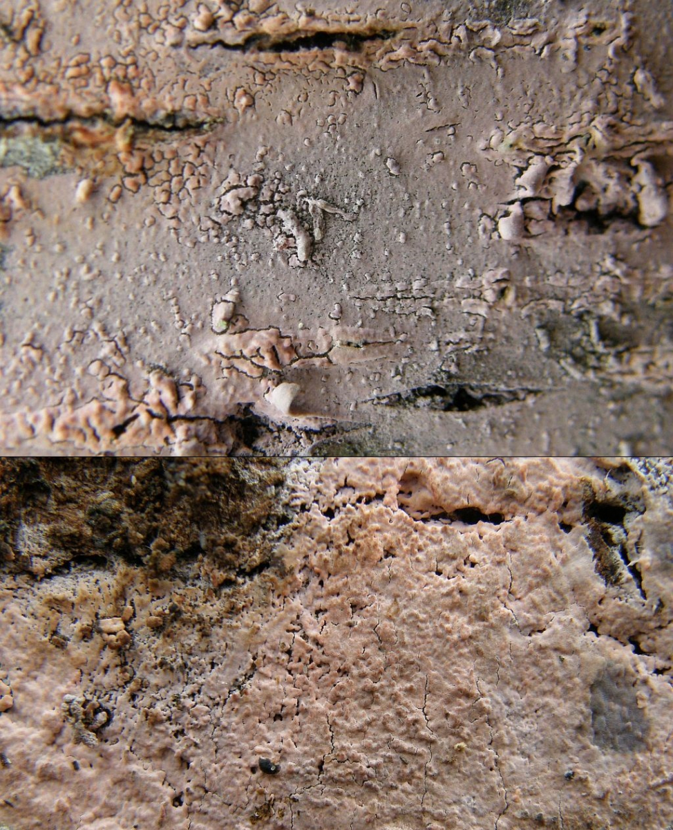makroskopische Eigenschaften: Fruchtkörper sehr dünn, frisch und an dckeren Stellen etwas wachsartig, an dünnen Stellen fein flaumig; glatt bis sehr schwach knubbelig, trocken rissig aufreißend; hell rosa bis rosabräunlich oder lachsfarben; ohne ausgeprägtes Subikulum und ohne ausdifferenzierten Rand.