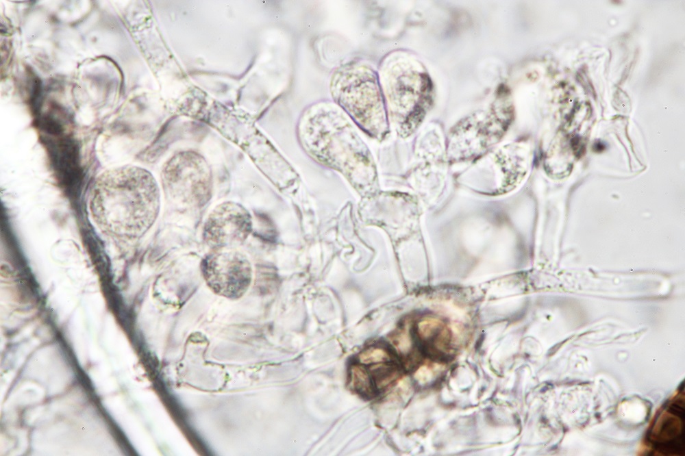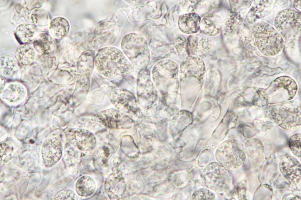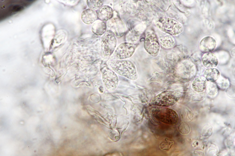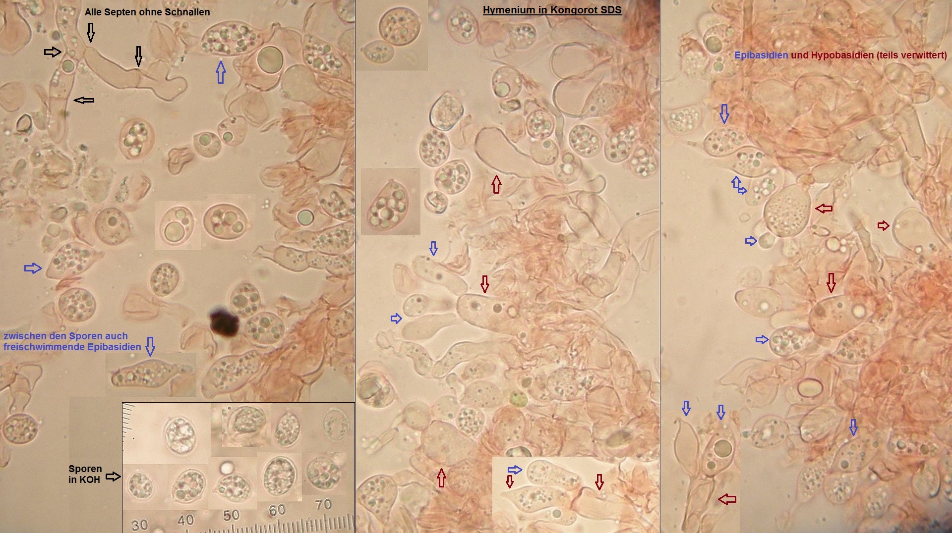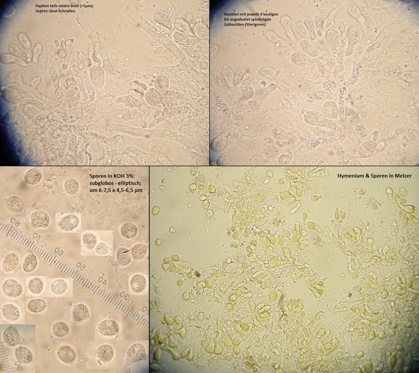 mikroskopische Eigenschaften: Hyphen breit, überwiegend dünnwandig, direkt am Substrat selten dickwandig, stellenweise irregulär aufgebläht, alle Septen ohne Schnallen; Zystiden fehlen, Hyphidien fehlen oder sind selten und unauffällig; Basidien breit bis schlank keulig, jung fast blasig; mit 2-4 Epibasidien (= stark verbreiterte Sterigmen), diese blasig bis spindelig oder ellipsoid; Sporen glatt, kugelig bis subglobos bis breitelliptisch stets unter 10mü in maximaler Ausdehnung