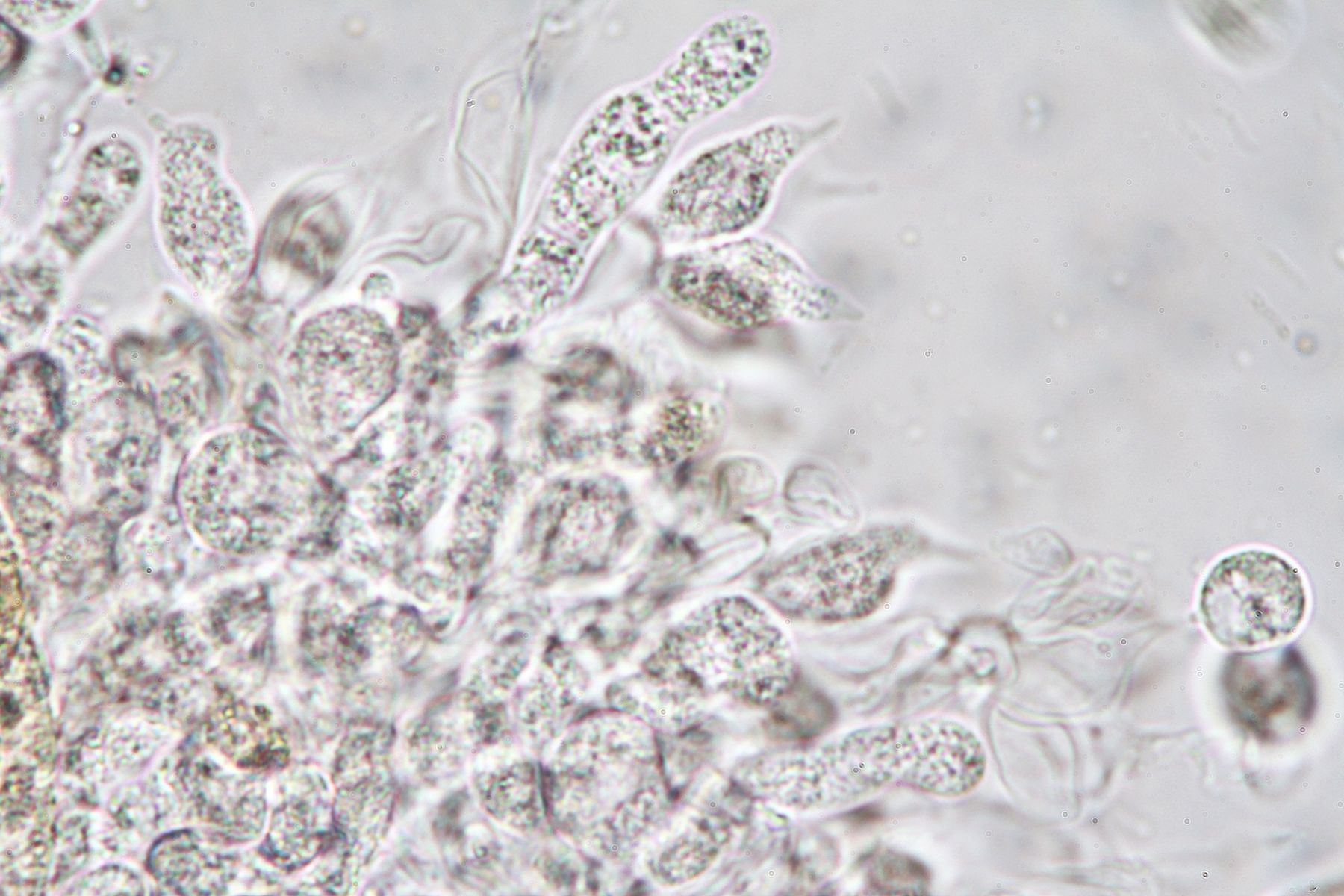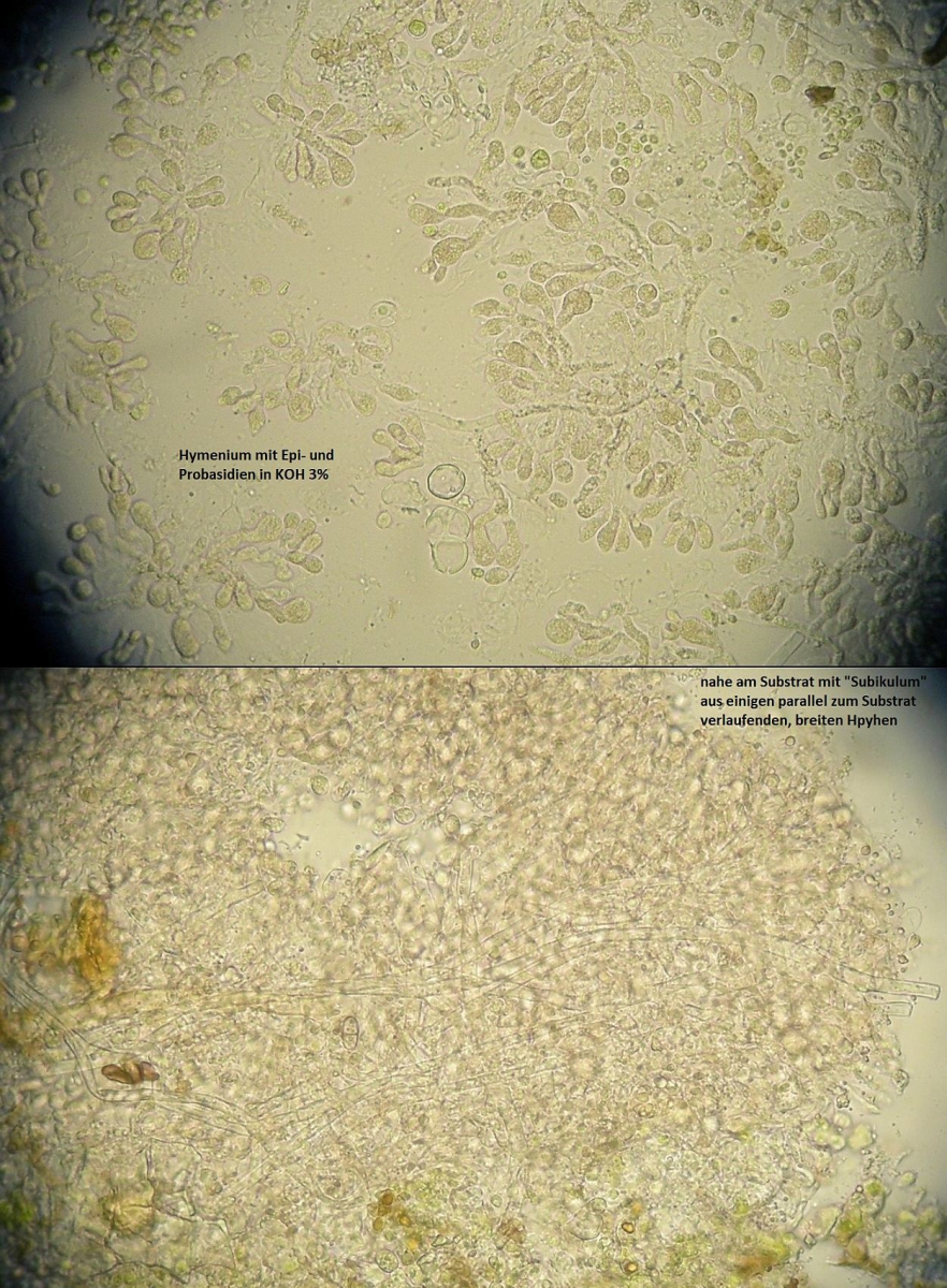 mikroskopische Eigenschaften: Hyphen breit, überwiegend dünnwandig, direkt am Substrat selten dickwandig, stellenweise irregulär aufgebläht, alle Septen ohne Schnallen; Zystiden fehlen, Hyphidien fehlen oder sind selten und unauffällig; Basidien breit bis schlank keulig, jung fast blasig; mit 2-4 Epibasidien (= stark verbreiterte Sterigmen), diese blasig bis spindelig oder ellipsoid; Sporen glatt, kugelig bis subglobos bis breitelliptisch stets unter 10mü in maximaler Ausdehnung