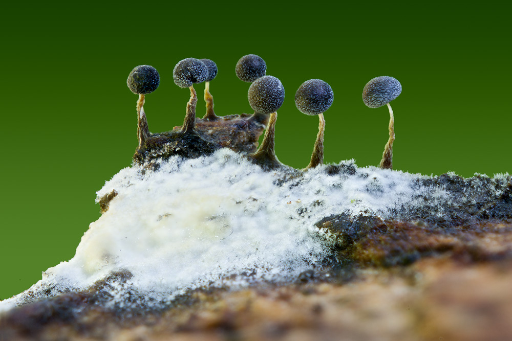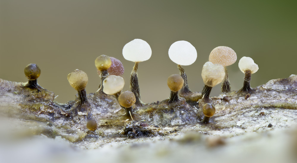 Deine zwei Schleimis sind voraussichtlich beide Physarum leucophaeum. Der erstere aber unreifer. Ph.leucophaeum hat in der "normalen" Ausbildung immer diesen gräulich-weißlichen Stiel, der nach oben heller wird.