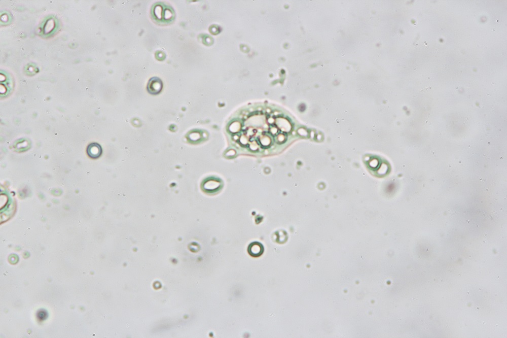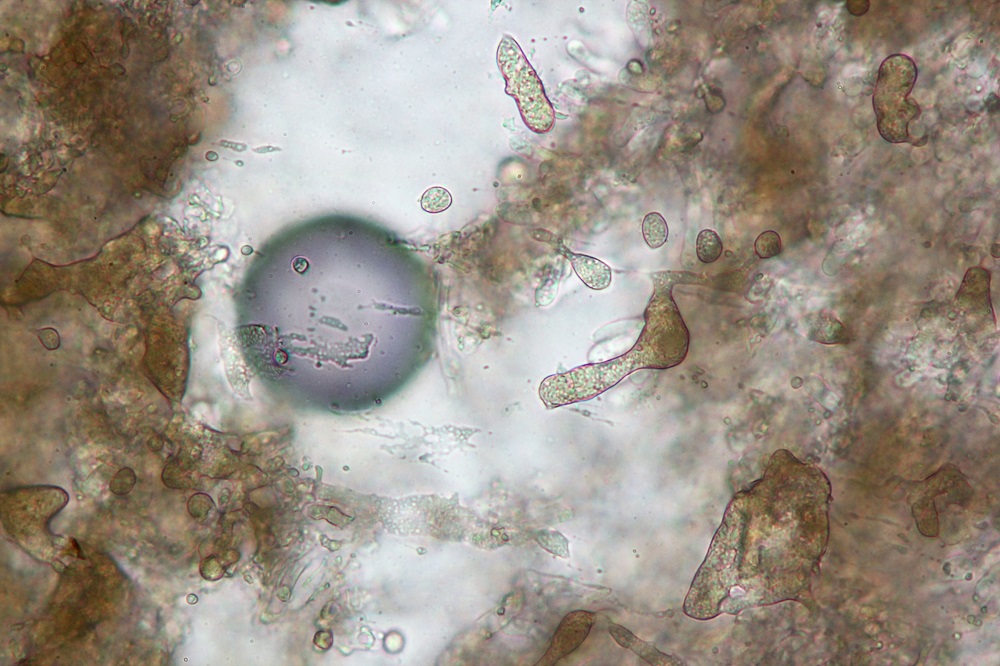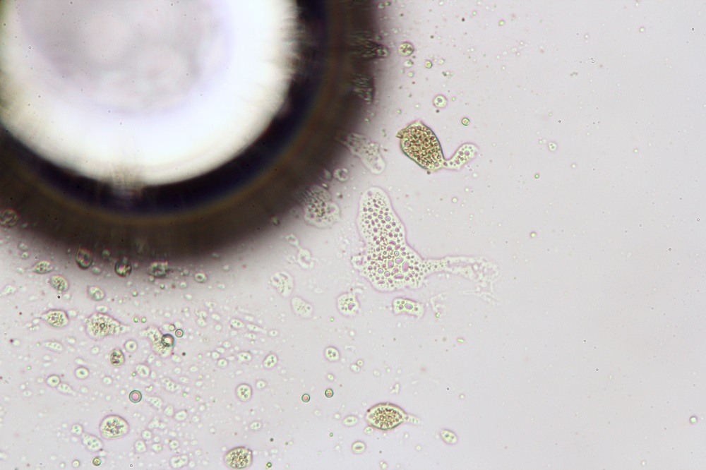 Statt Sporen waren da überall Amöbenartige Gebilde zusehen. Auch im nächstem Präparat waren diese Gebilde vorhanden, wenn auch in begrenzten Maße.