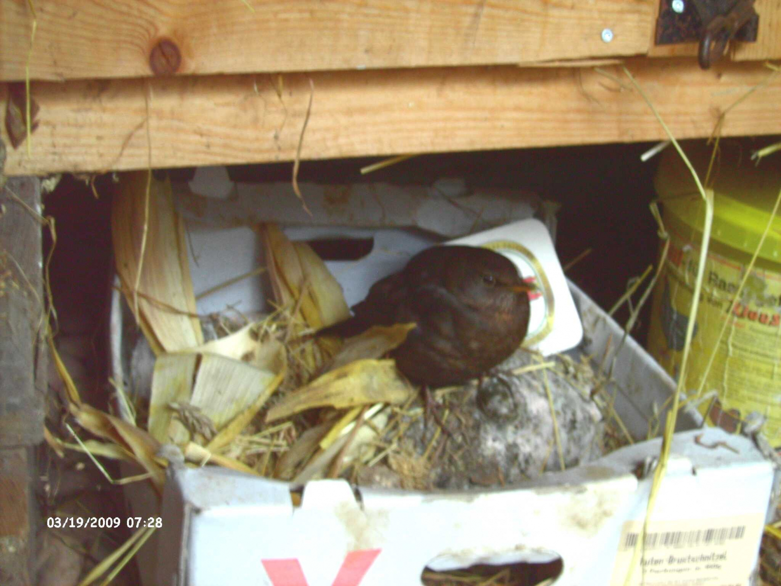 Ein Bild zum Schluss von heute Morgen, meine ;) Hofamsel, sie hat schon mehrere Bruten bei uns aufgezogen und ist ganz zahm, hier sitzt sie unter dem Zwergkaninchenstall meiner Tochter und wartet auf ihr Frühstück! Sie bleibt so lange sitzen bis ich ihr etwas Apfel oder Haferflocken gegeben habe.
