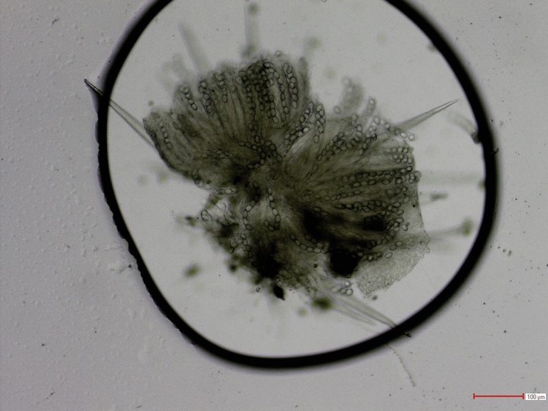 Was mich halt irritiert: Ich habe ja nur einen einzigen Fruchtkörper unters Mikroskop gelegt, und der war nach den an der Basis breiten Haaren und großen Sporen eben ciliatus. Und DA DRINNEN bzw dazwischen finden sich, wie auf dem Foto zu sehen, schmälere Asci mit kleineren Sporen....