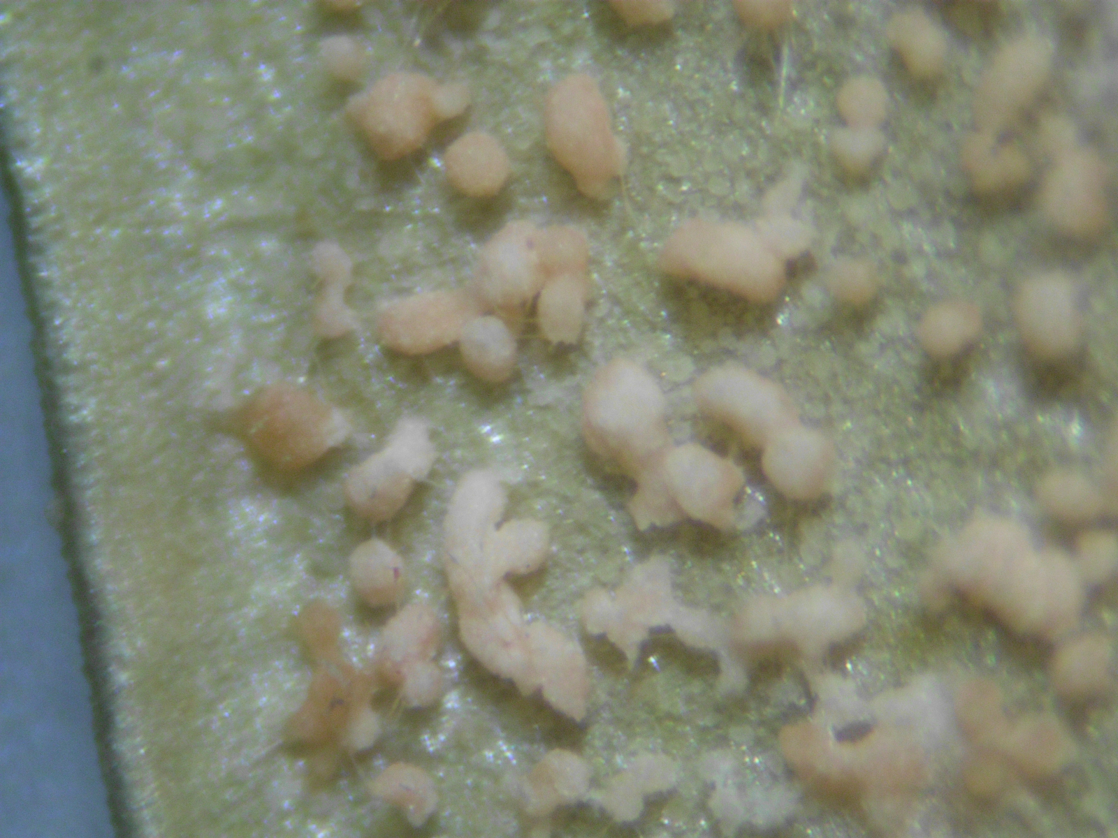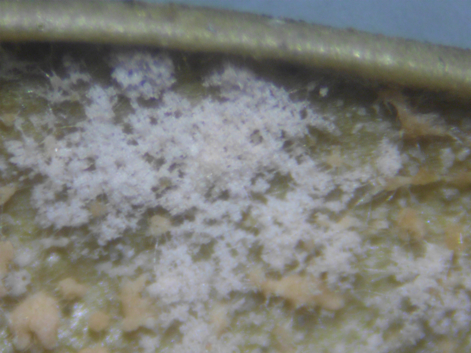 Meistens findet man an der Unterseite der Blätter, vorwiegend einen weißlichen bis später fast rosafarbenen Belag der anamorphen Form.