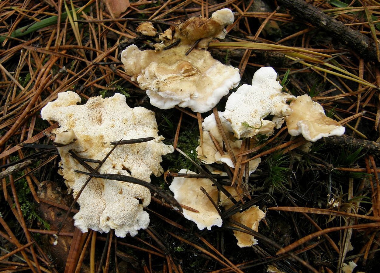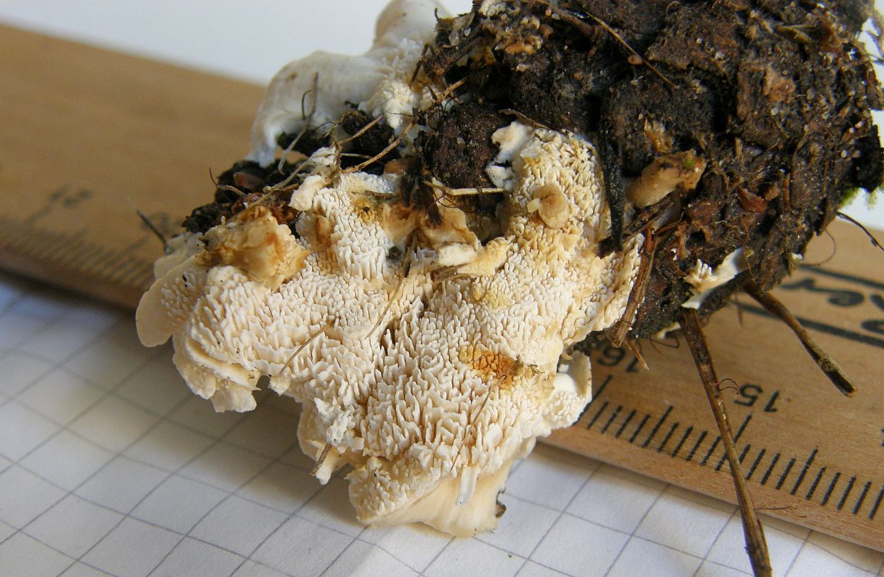makroskopische Eigenschaften: Fruchtkörper eher klein und schmächtig (Hütchen so um die 1-5 cm); weißlich, aber in allen Teilen bald ockergelblich bis bräunlich verfärbend / fleckend; normalerweise gestielt oder kreiselförmig, wo sich Hölzer oder ähnliche Strukturen zum rumklettern finden auch effus-reflex; Stielchen meistens relativ dünn, manchmal recht kurz (<1cm bis 2,5 cm) mit glatter, mehlig wirkender Oberfläche; Hütchen unregelmäßig geformt, oft zusammenwachsend; von der Mitte her bräunend und dadurch undeutlich zoniert; Hutoberfläche anfangs feinfilzig, bald verkahlend und nur noch am Rand fein wollig-flaumig, völlig ohne radiär anliegende oder abstehende Haare, Fasern oder Fransen; Hymenophor anfangs netzig –“ porig, bald mit geschlitzten Porenwänden und dann labyrinthisch bis plattig –“ stachelig / irpicoid; Hymenophor am Stiel herablaufend; Fleisch weißlich, frisch recht weich und brüchig, getrocknet hart und bröckelig; mit komischem Geruch, der möglicherweise je nach Alter zwischen süßlich –“ vanilleartig und unangenehm süßlich –“ modrig schwankt, aber auch ziemlich undeutlich ausgeprägt sein kann.