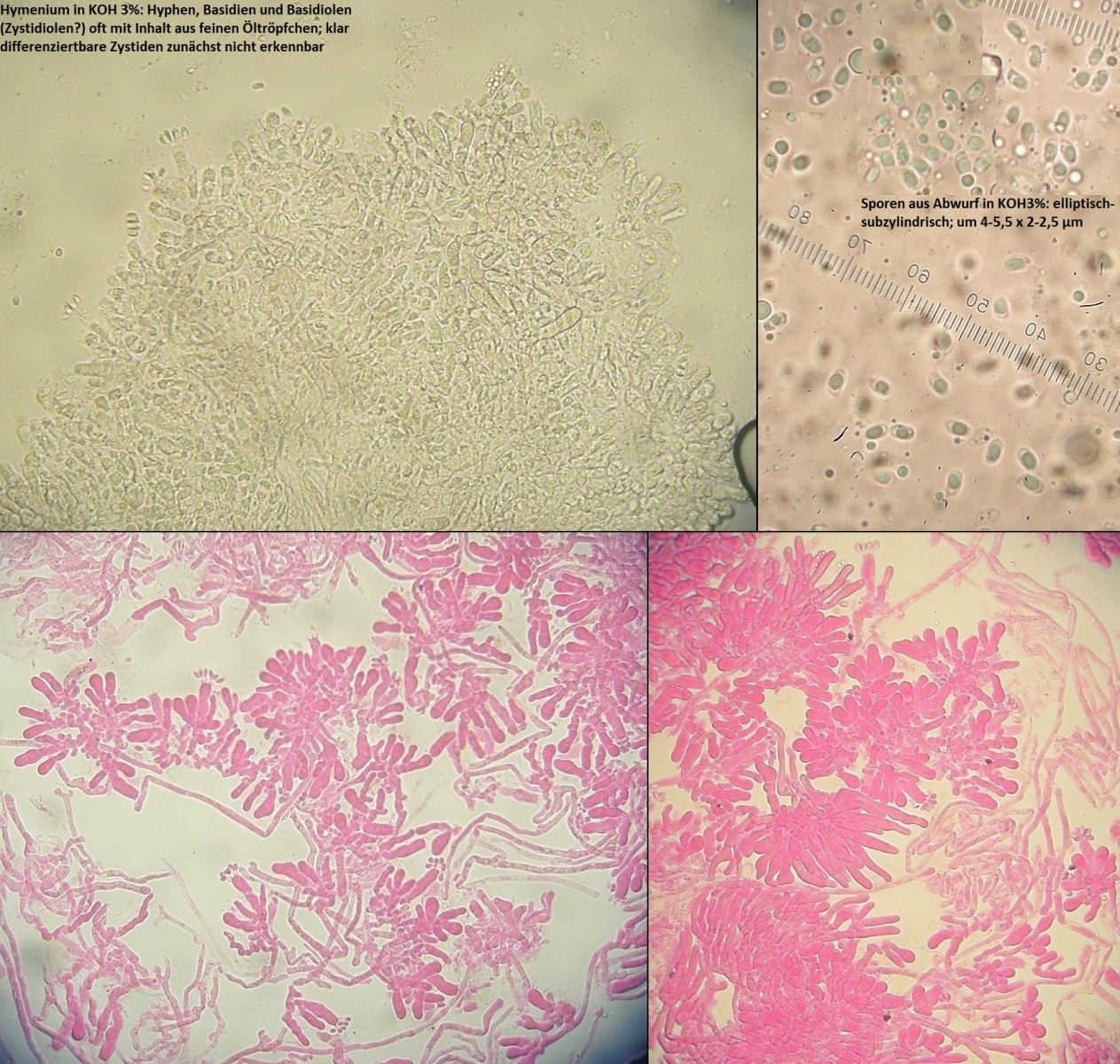 Mikroskopisch wird es dann sehr schnell sehr eindeutig bei makroskopisch dubiosen Kollektionen: Von den genannten Verwechslungsmöglichkeiten wäre Hydnum (albidum) zB der einzige, der mehr als 4 Sporen an einer Basidie bildet. Dafür sehen dort zB die Basidien selbst ganz anders aus (nicht urnenförmig). Und alle anderen in Europa heimischen Arten der Gattung Sistotrema sehen schon makroskopisch total anders aus.