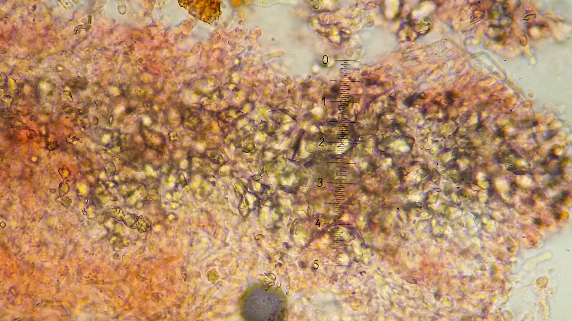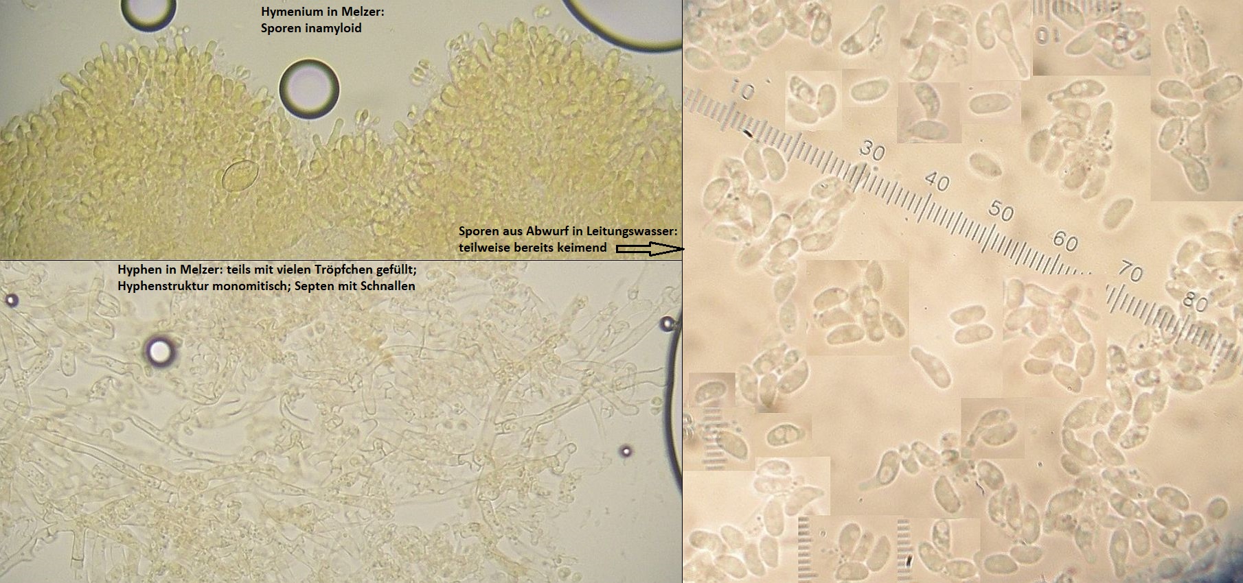 mikroskopische Eigenschaften: Hyphenstruktur monomitisch, Hyphen meist dünnwandig & eher locker verknüpft, im Subikulum auch etwas dickwandig, viele Hyphen mit Öltröpfchen, Septen mit Schnallen; gelegentlich mit Anschwellungen an den Septen (selten beobachtet); oft mit vielen groben Kristallen im Subhymenium und Subikulum; keine Zystiden; Basidien (reif) urnenförmig, mit 2 bis 8 Sterigmen; Sporen glatt, dünnwandig, inamyloid, suballantoid; 3,8-5,5 x 2-2,7 µm (eigene Messungen)