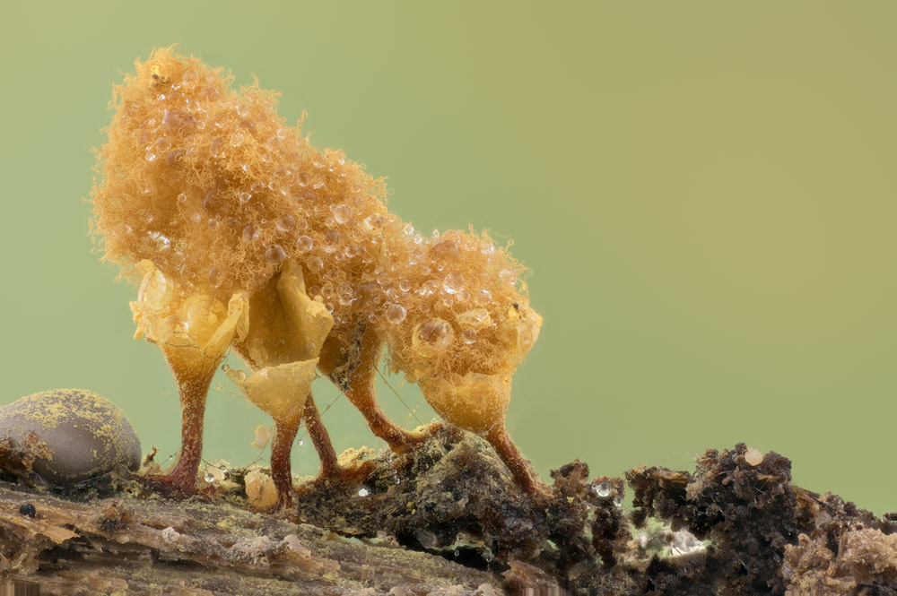 für mich ist das eine der makroskopisch recht ähnlichen Arten entweder aus der Gattung Hemitrichia, Trichia (hier: decipiens) oder sogar eine Arcyria-Art. Trichia varia passt mir optisch nicht, weil bei der Art der manchmal vorhandene Stiel irgendwie immer so aussieht, als würde er nicht zum Objekt gehören. Er wäre auch nie so dünn wie bei den mittleren Bildern. Hemitrichia calyculata glaube ich auch eher nicht, weil der Stiel da vermutlich noch dünner, abgesetzter und dunkler wäre. Zum Rest der Optionen schweige ich lieber. Eben wieder ein typischer Fall fürs Mikro. :)