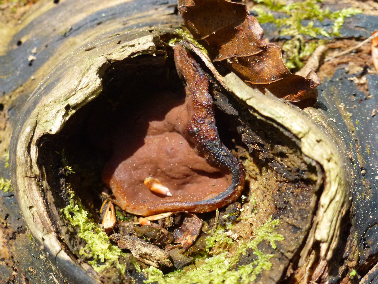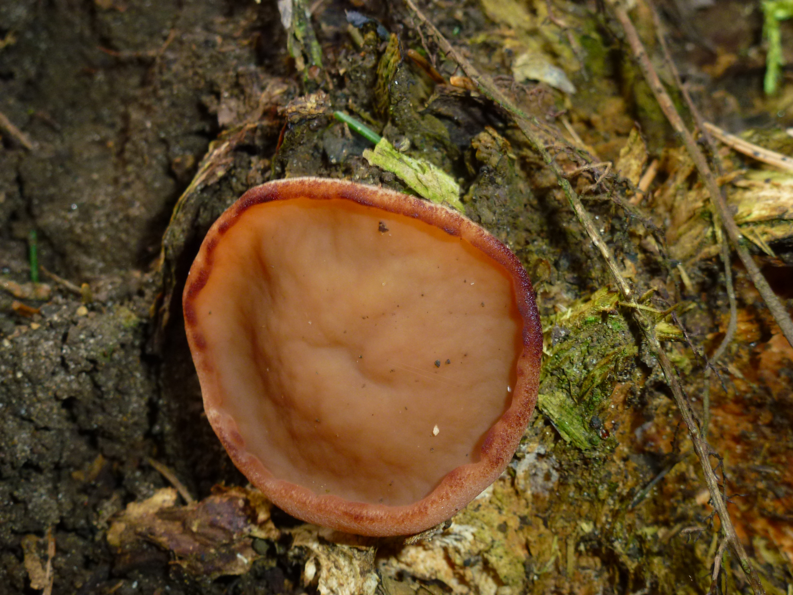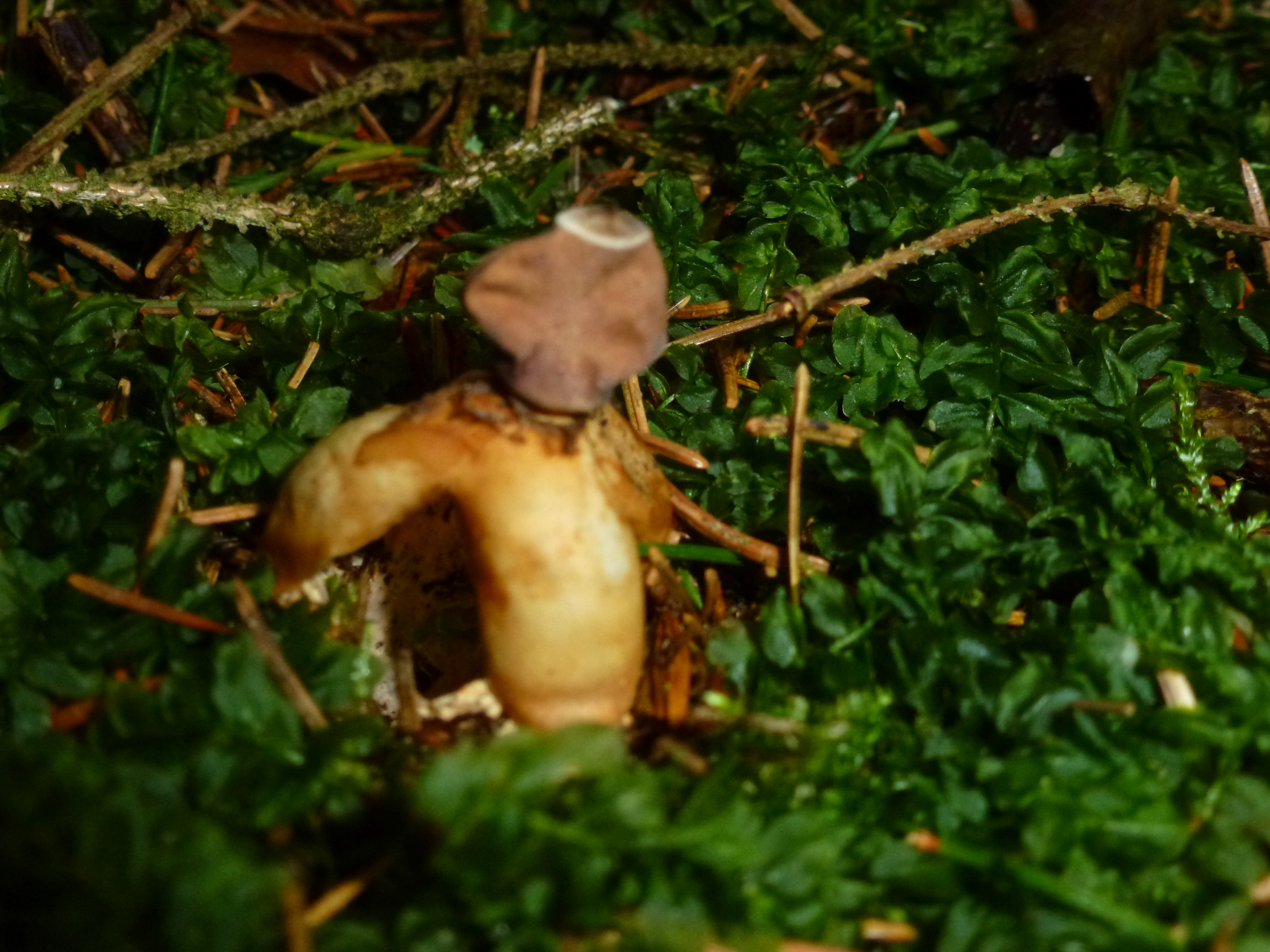 Interessant: Unten im Boden befindet sich das "Nest" auf dem der Pilz sitzt. Wie eine kleine Schale, an der die Enden der vier Lappen festgewachsen sind.