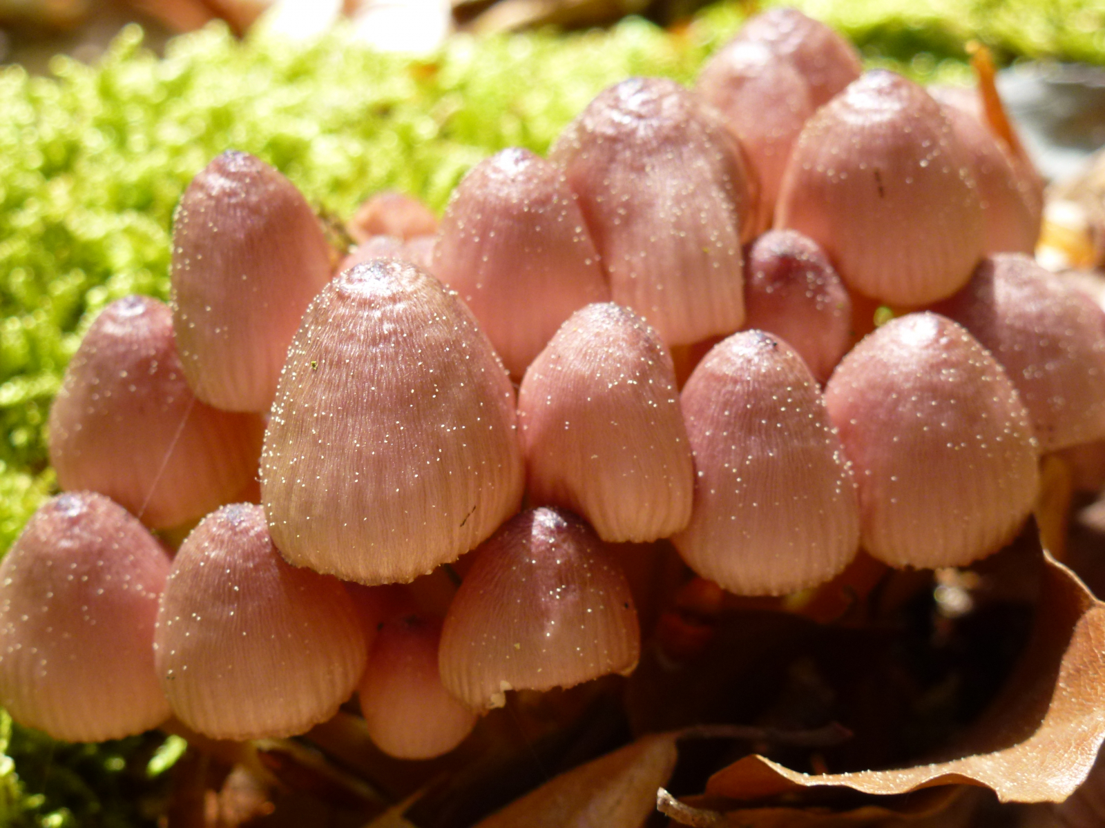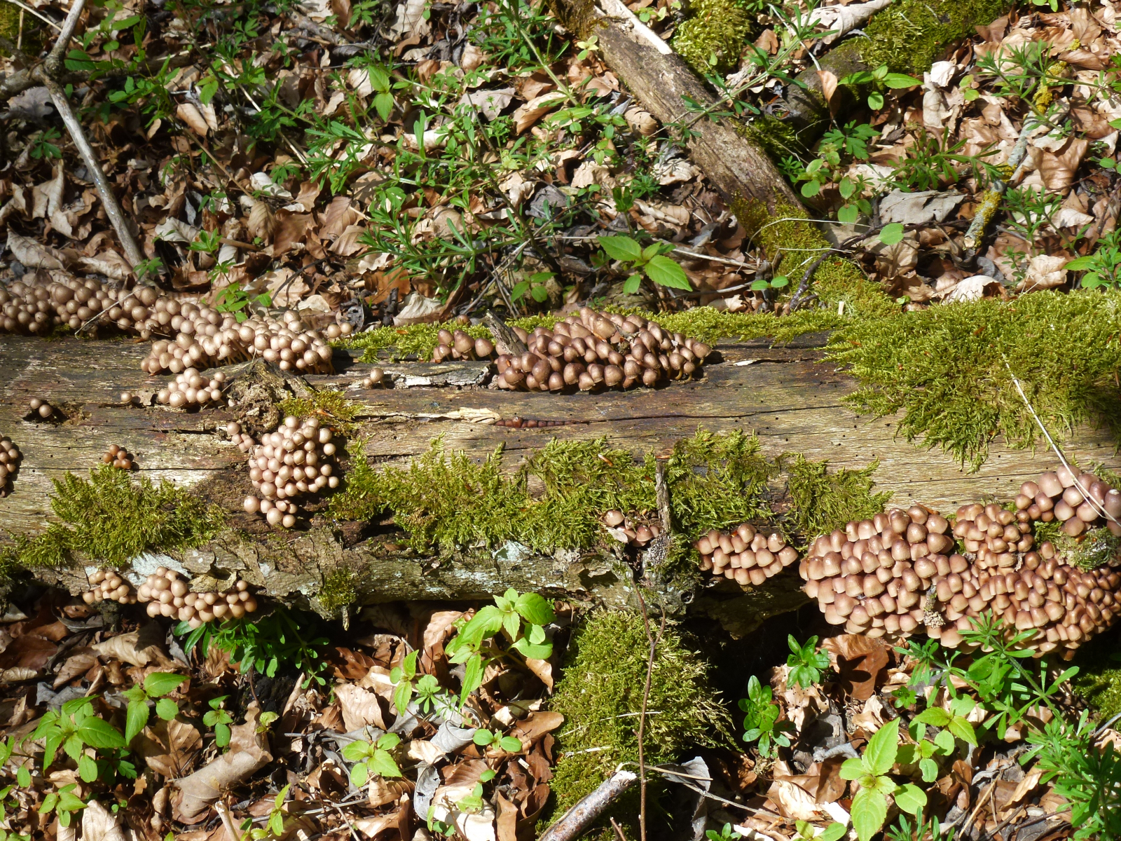 die büschlig wachsenden kleinen Pilze nach der Speisemorchen. Die sehen interessant aus. Von der Hutfarbe her denke ich da an Mycena renati, den Gelbstieligen Nitrathelmling; andererseits die Körnchen auf dem Hut deuten auf einen Tintling hin; in dem Fall Coprinellus disseminatus; der Gesäte Tintling. Dafür sind mir die Hüte zu rötlich. Kann es sein, dass die Bilder nicht ganz farbecht sind?