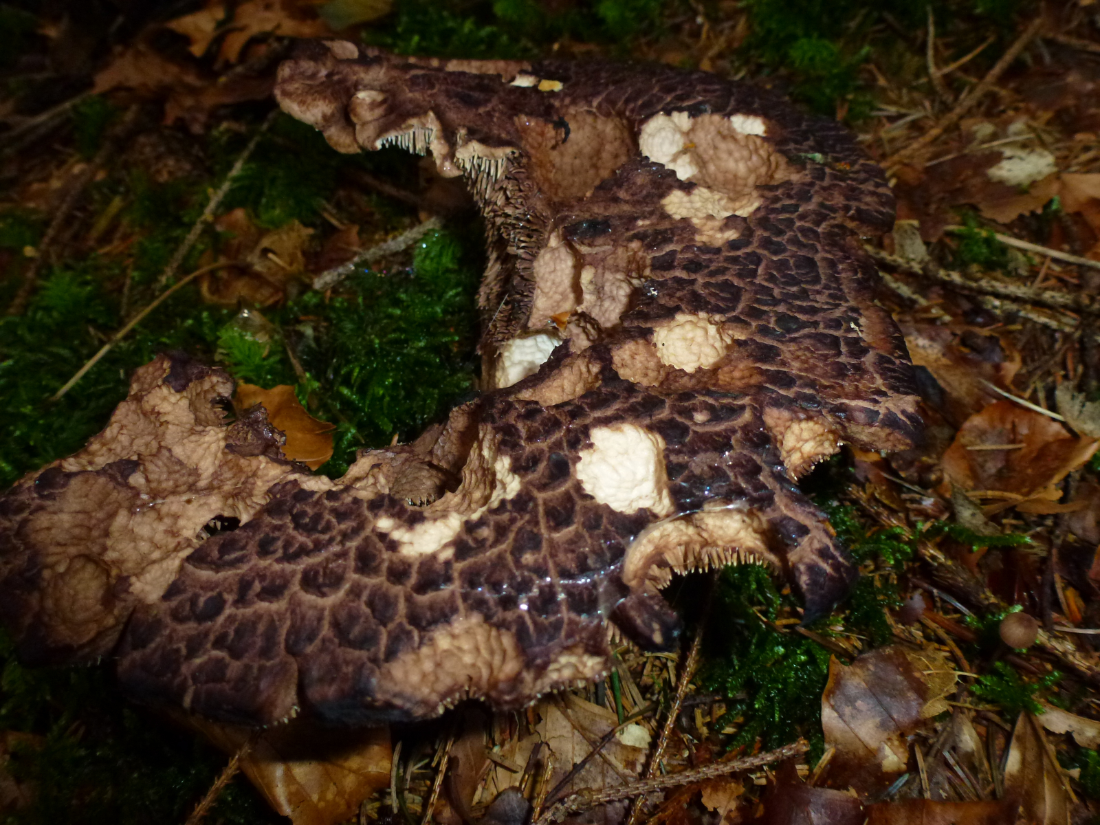 Es fing an mit diesem mehr als beeindruckendem Pilz - Spongipellis pachyodon - Dickzahniger oder Breitstacheliger Schwammporling. Dieser Pilz scheint zumindest in Bayern relativ selten zu sein, eine Kartierung konnte ich nicht feststellen. In Altmühlfranken wächst er aber und heute habe ich gleich ein weiteres Exemplar gefunden.