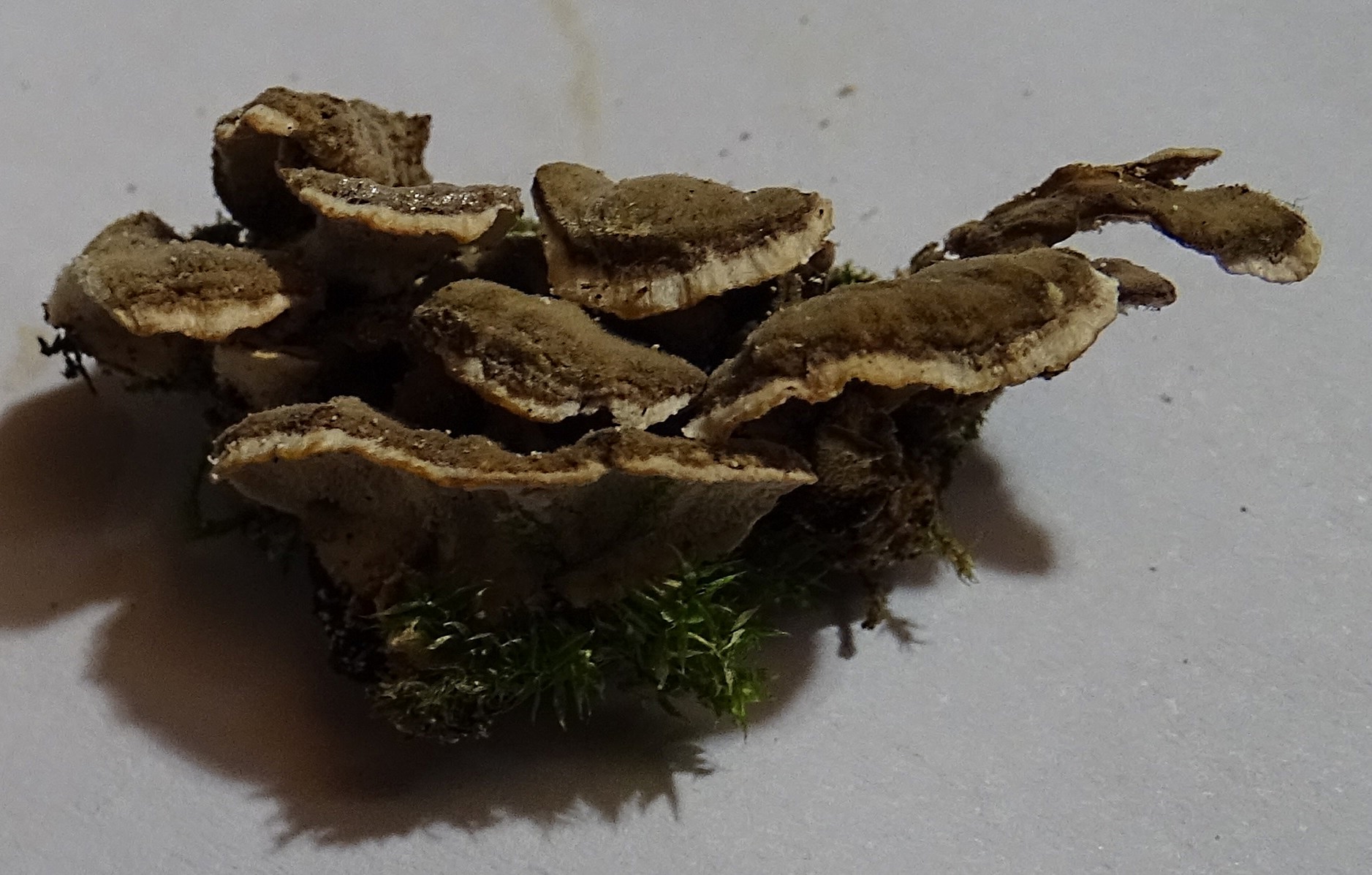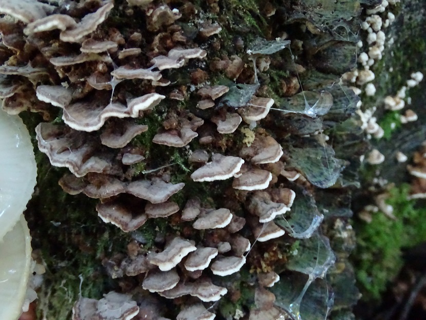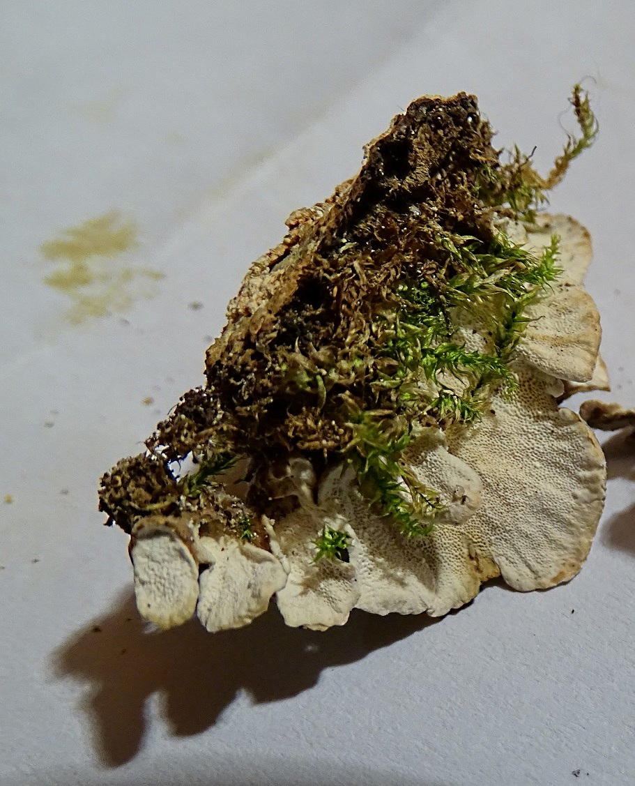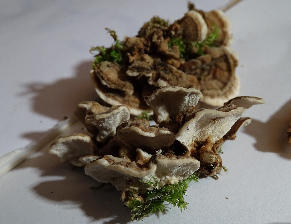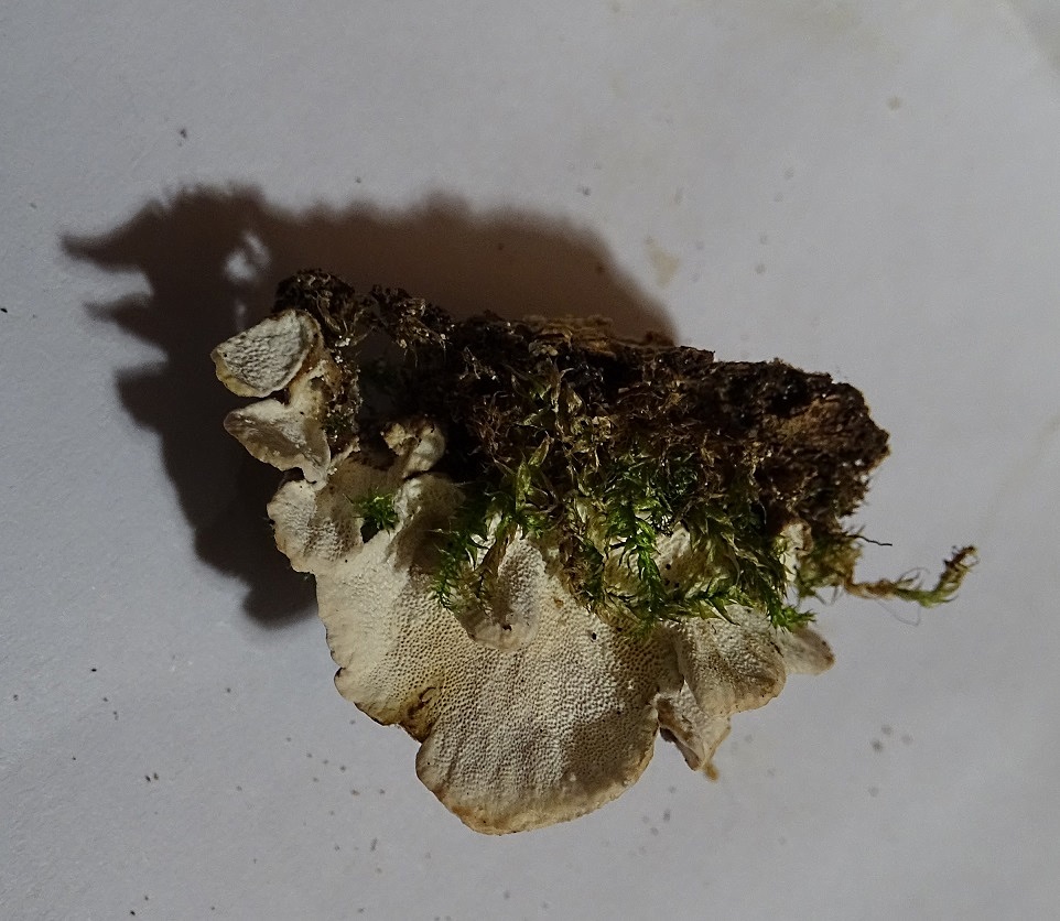 Immer noch Altlasten, auch den hatte ich damals - Okt. 2015 - zur Seite gelegt, auch gefunden am Otterbach / Südpfalz. Irgendwie erinnert er mich an Bjerkandera, aber dann wieder doch nicht. Die OS ist so schön feinfilzig, und auf einigen der Fotos sieht er dann fast aus wie Auricularia mesenterica - aber dann darf man die US nicht ansehen, die hat Poren, und das passt ja nun garnicht. - Jetzt habe ich den Entwurf ein paar Tage stehen lassen aber immer noch keine bessere Idee als euch die Fotos zu zeigen. Leider sind die Freilandbilder gräßlich schlecht, irgenddwie war ich noch auf Kriegsfuß mit der neuen Kamera, aber wenigstens einen Eindruck von der Wuchsform bekommt man: