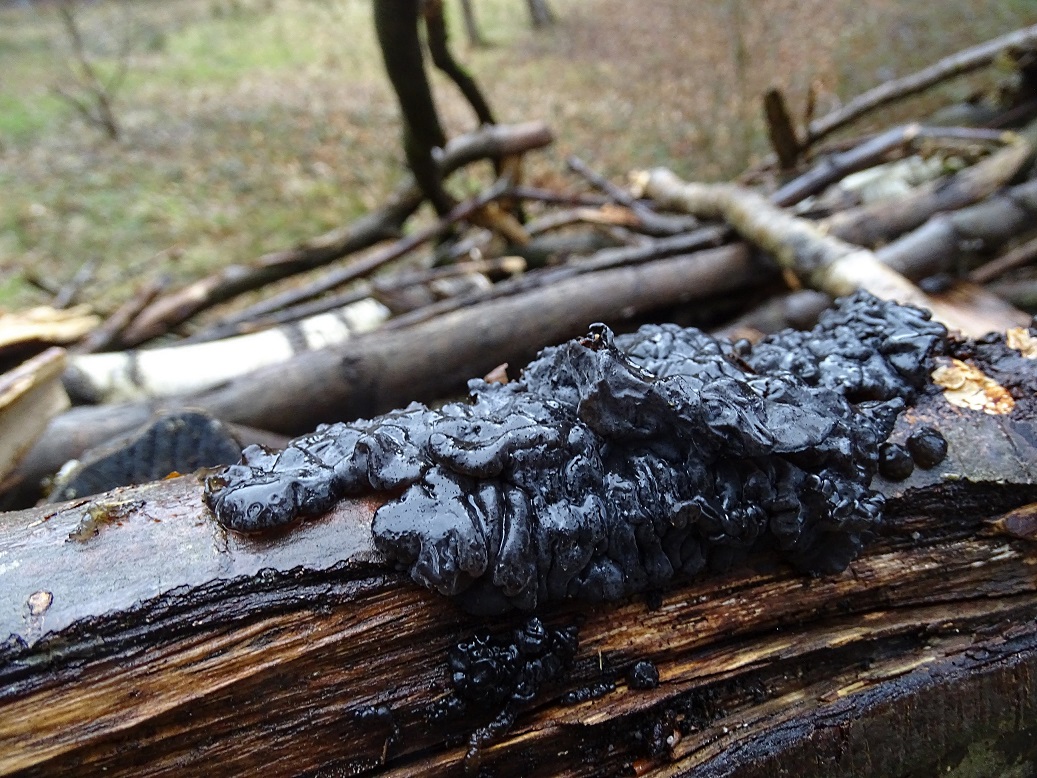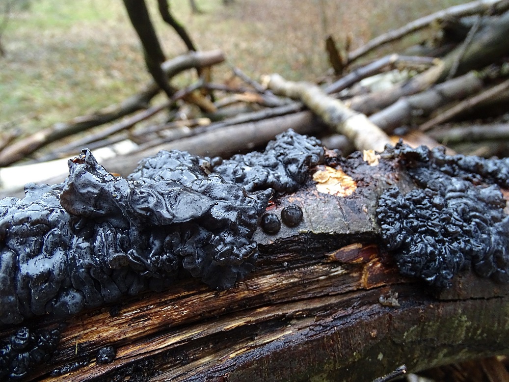 ausnahmsweise mal was ganz aktuelles, von heute. Trotz tendenziell eher regnerischem Wetters sind wir ins Modenbachtal am Rand des Pfälzerwaldes gefahren, dann zur PWV-Hütte 7-Quellen. Auf dem Wege kamen wir an einem Holzstapel vorbei - da hätte man Stunden zubringen können. Leider wurde der Regen stärker, so dass wir doch nach einigen wenigen Fotos uns Richtung Hütte bewegt haben. Trotzdem denke ich, drei verschiedene Exidia-Arten gefunden zu haben. Mangels Erfahrung und auch aus anderen Gründen bleiben Restzweifel, so dass ich sie kurz vorstellen möchte: